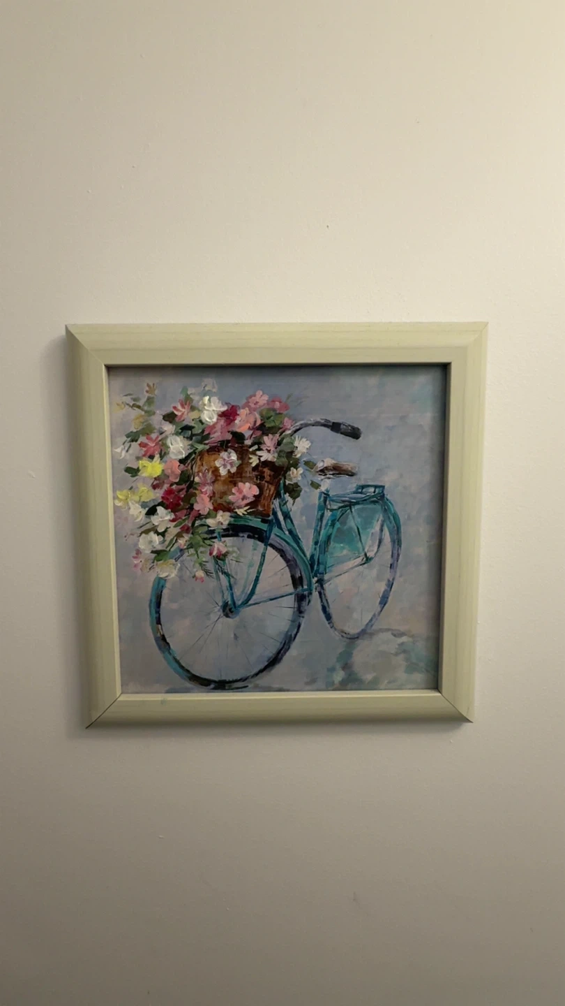 This framed canvas depicts a vintage-style bicycle laden with a basket full of colourful flowers. The artwork has a pastel blue background. It's ready to hang and adds a touch of charm to any room.