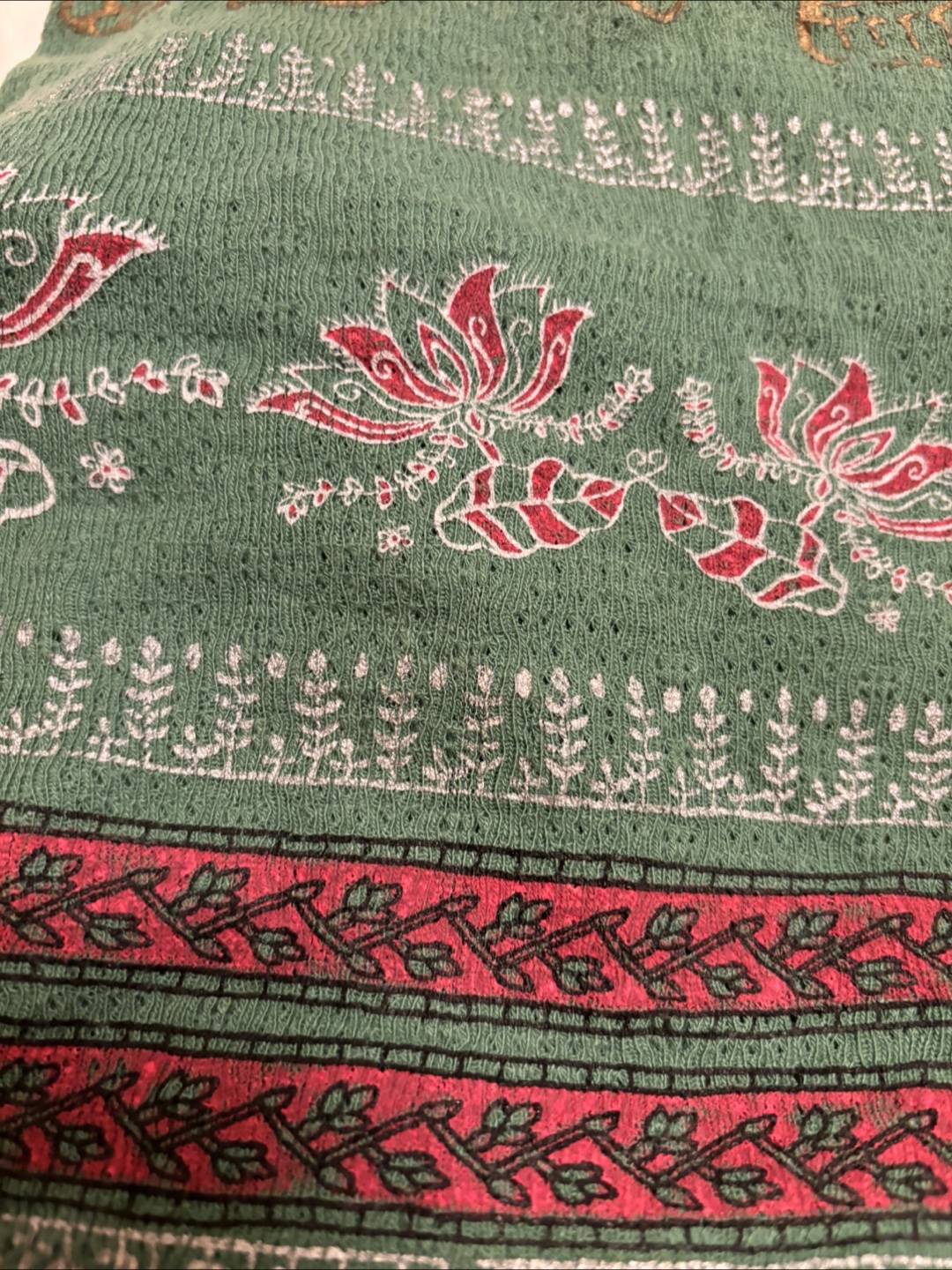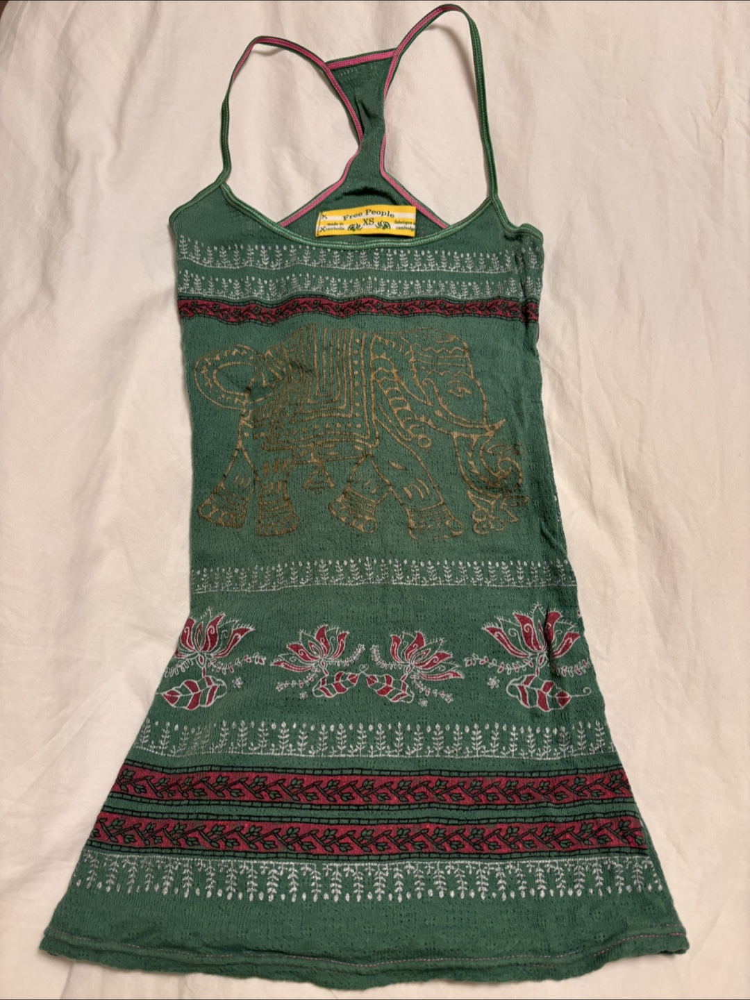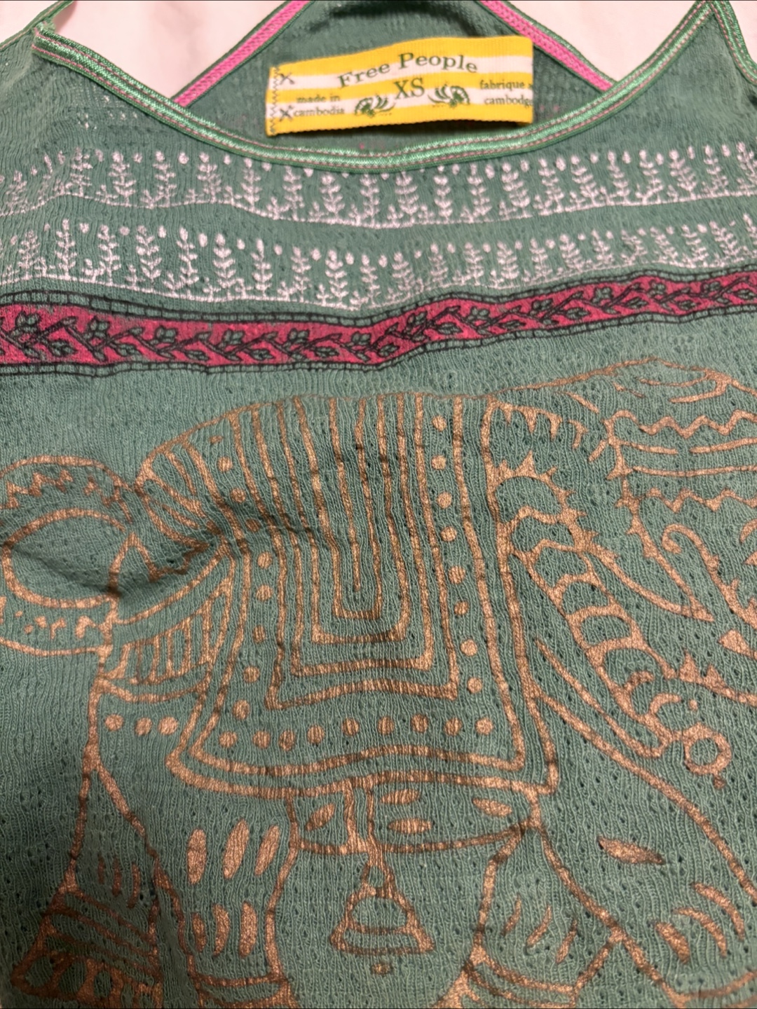 Green tank top. Sleeveless. Features various patterns and an elephant design. Would look great with a pair of jeans.