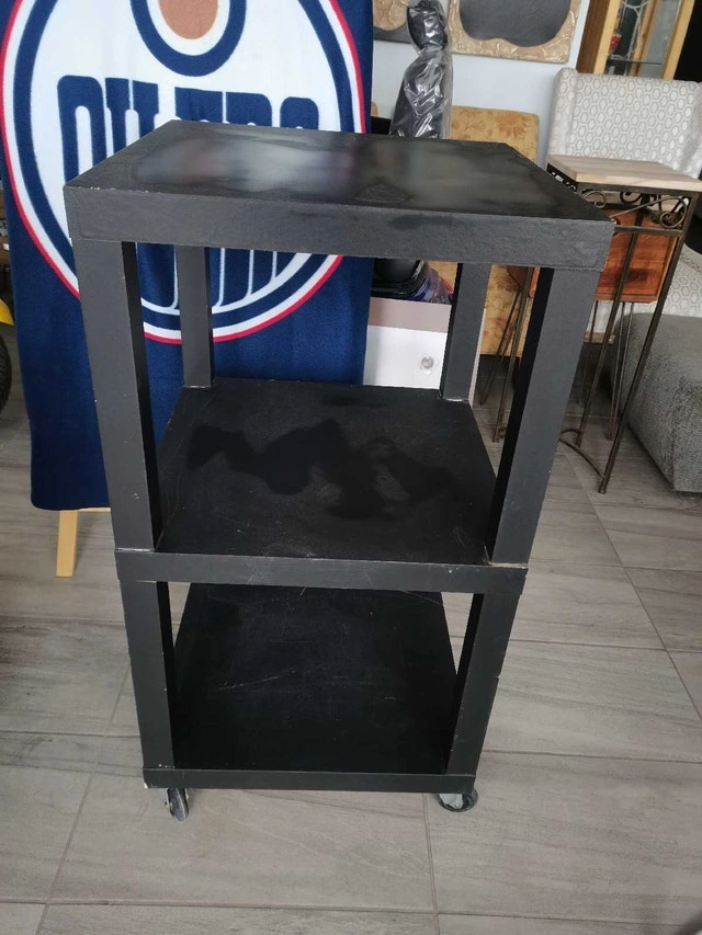 Good useful utilities rolling cart, black in color, 3 tiers, flat surface wide. Dimensions are 21.75"x21.75", height in between is 18", total height is around 40". Good wheels, rolling well. Pick up near Chinook.