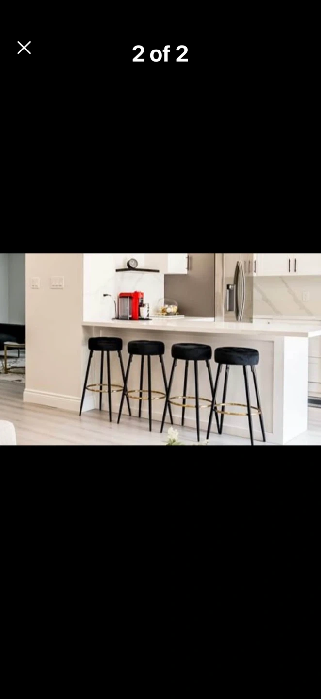 These four bar stools feature a comfortable black velvet seat and a sturdy black metal frame. They include a gold ring footrest for added style and comfort. These stools would be great for a kitchen island or home bar area.