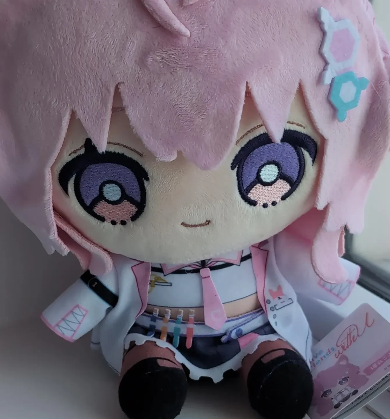 This is a soft, pink plush featuring Hakui Koyori from Hololive! This cure coyote vtuber has large purple eyes and a lab coat outfit. Perfect for anyone interested in Hololive!