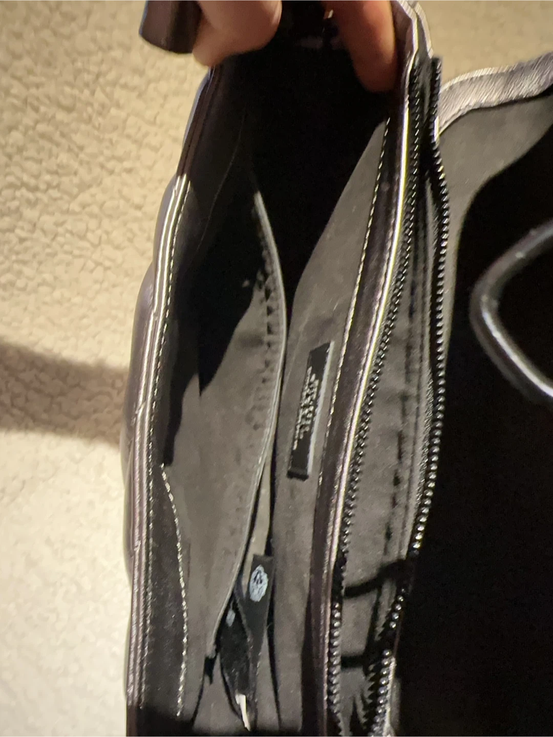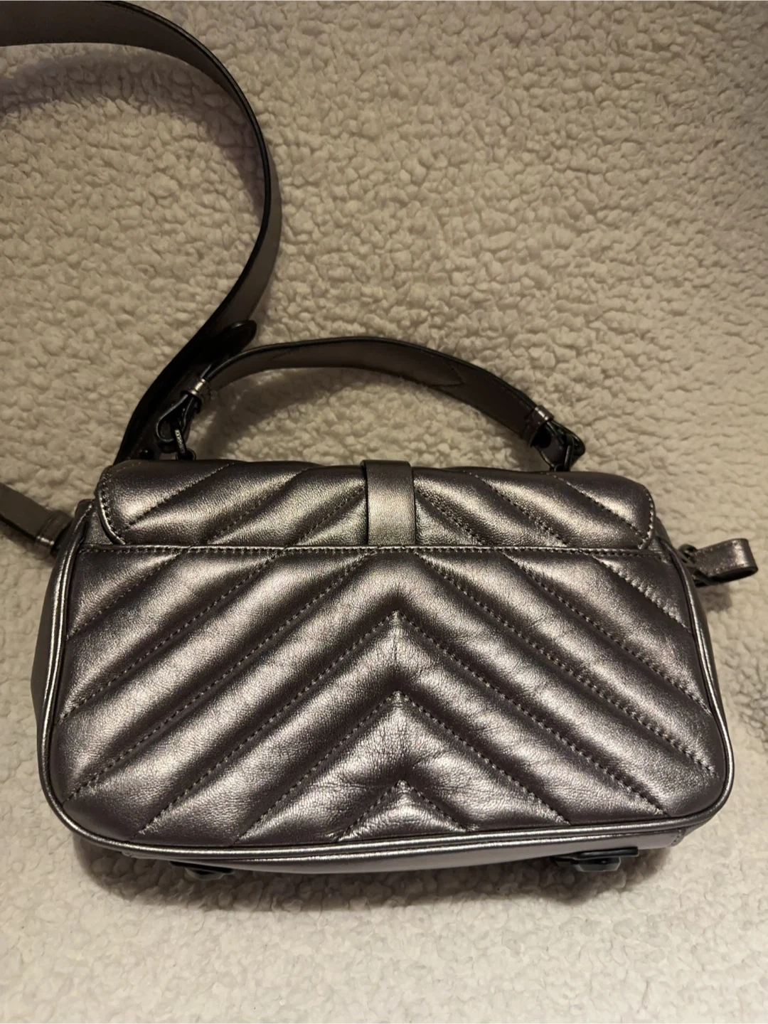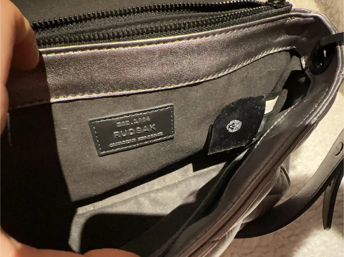 This is a Rudsak crossbody bag with a metallic leather finish. It features a quilted chevron pattern and a secure buckle closure. Inside, you'll find a zippered compartment for extra storage.