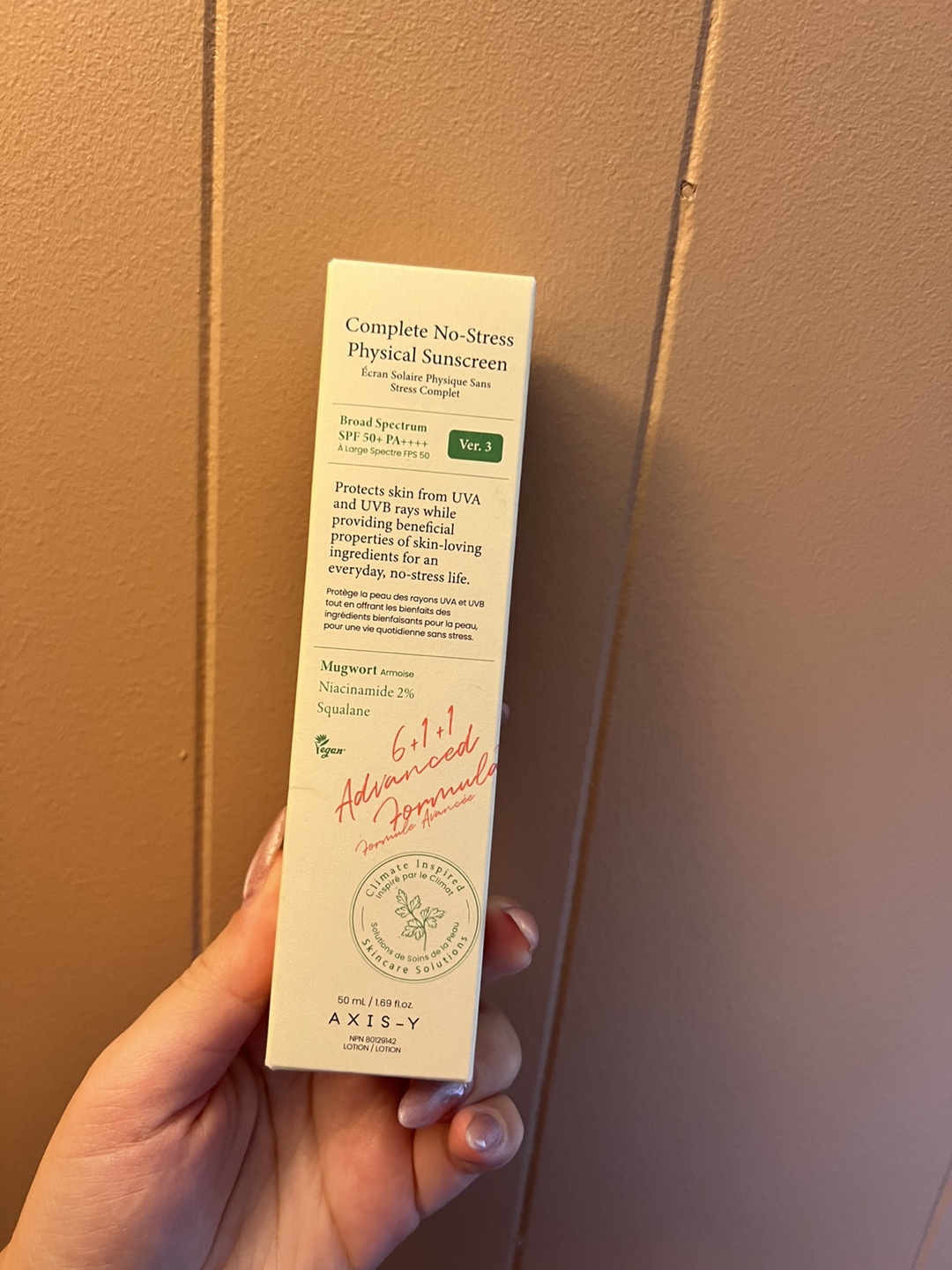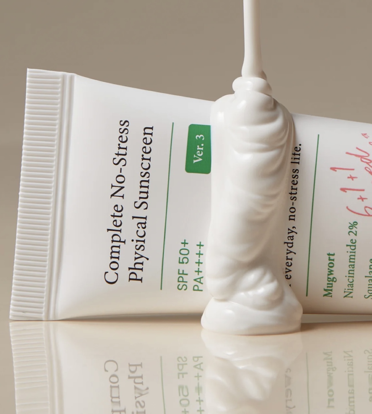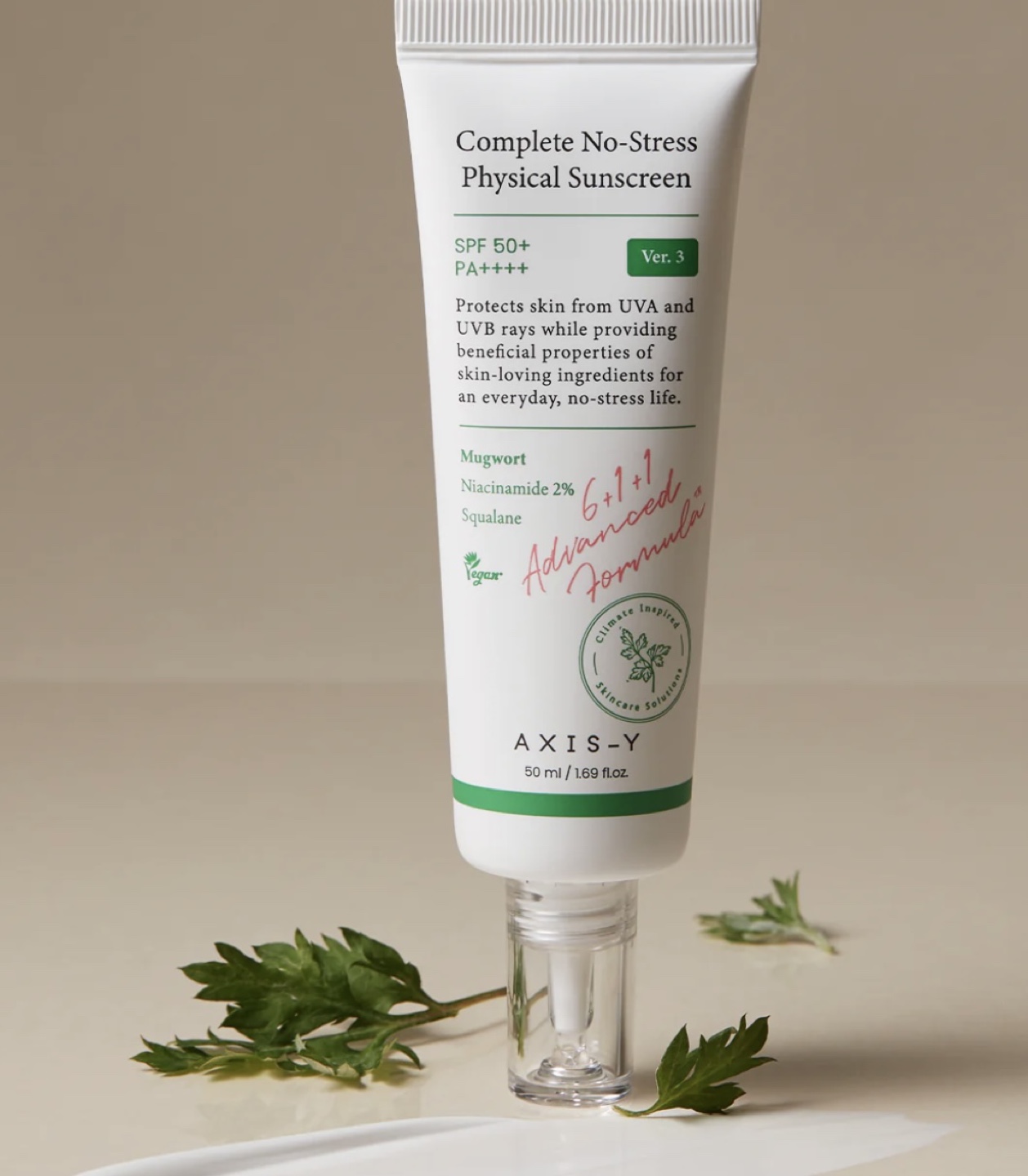Selling a tube of Axis-Y Complete No-Stress Physical Sunscreen! It's SPF 50+ PA++++ and contains beneficial properties from skin-loving ingredients for an everyday, no-stress life. Contains Mugwort, Niacinamide 2%, and Squalane. It's also vegan!