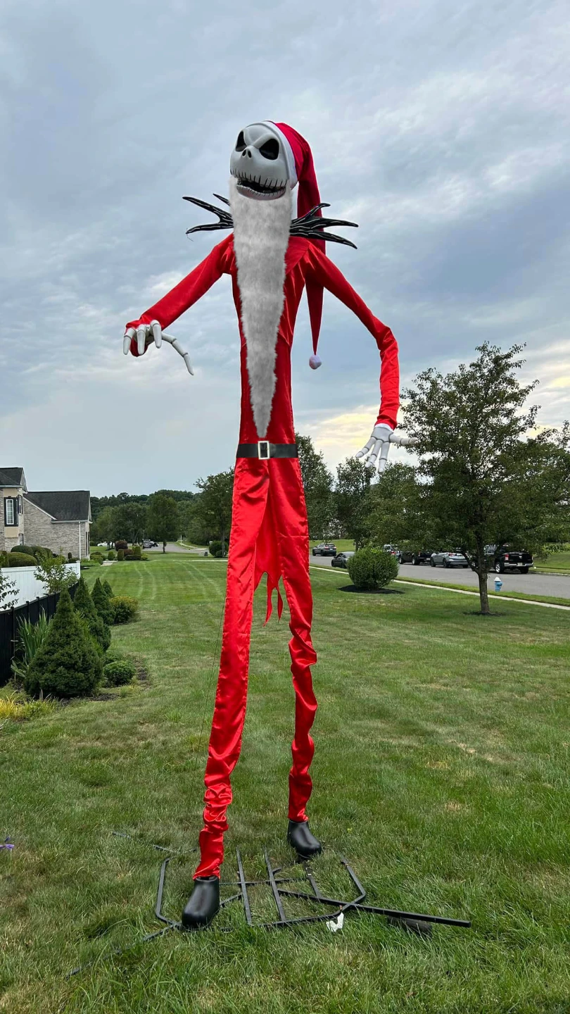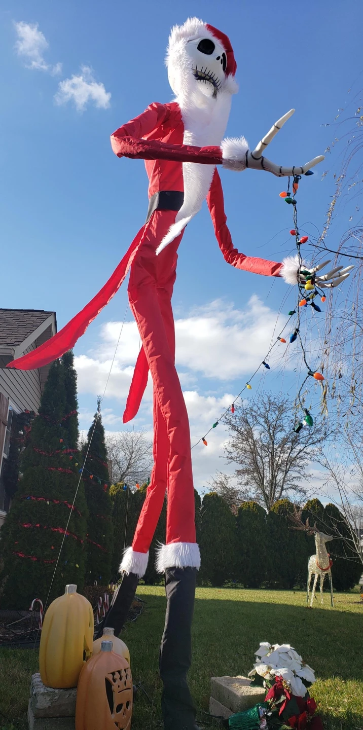 High-quality 13-foot Jack Skellington Santa costume. Includes Santa hat, beard and suit. Strong build, well made, and waterproof.Great for outdoor holiday displays. Perfect for fans of the movie to add a unique touch to their Christmas display!