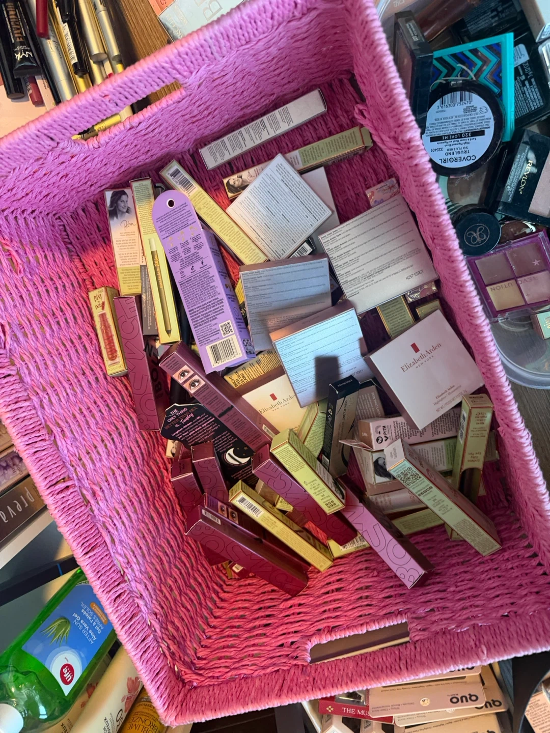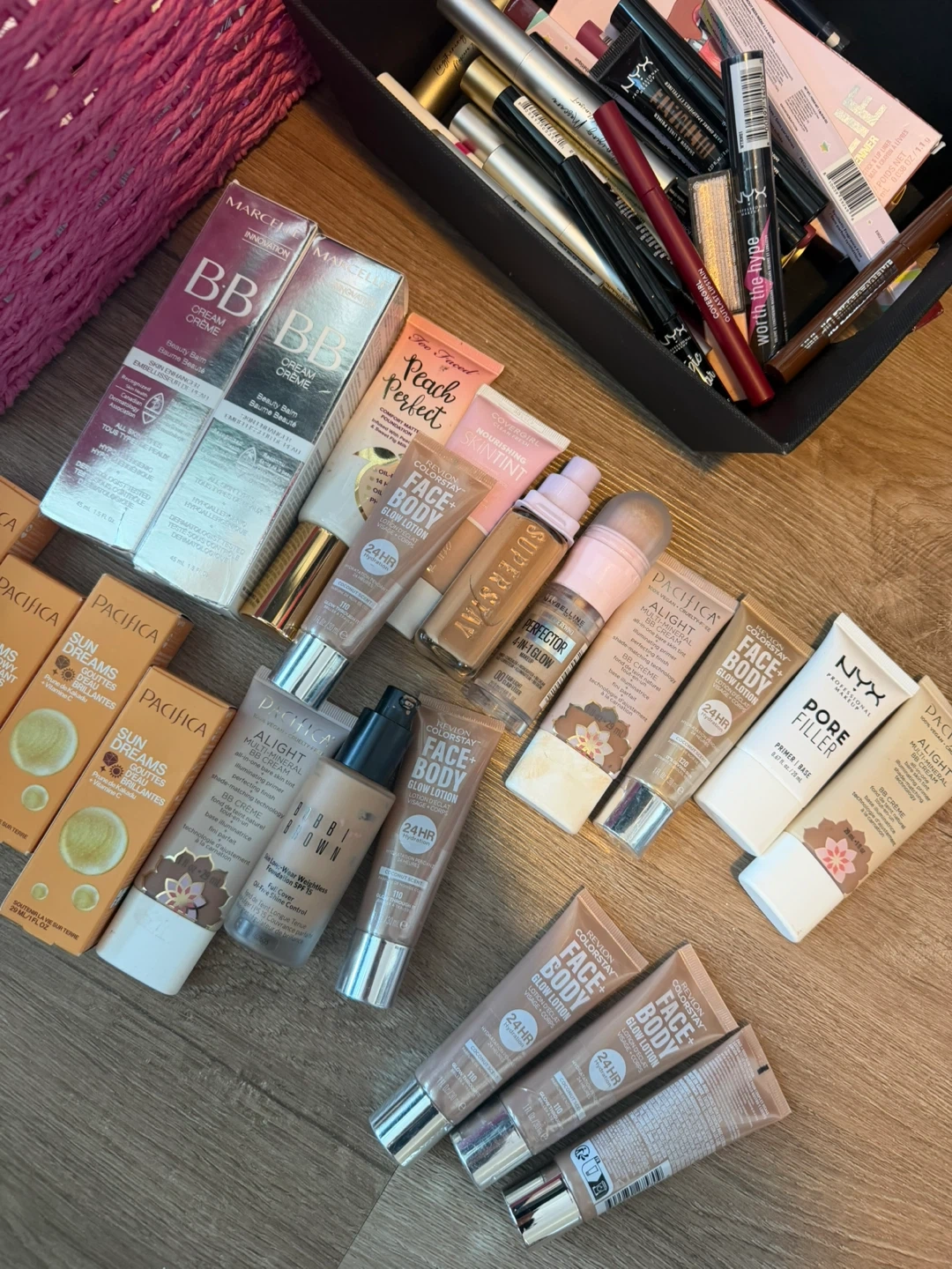 A large collection of makeup items including foundations, BB creams, lipsticks, and blushes from various brands. Includes popular names like NYX, Pacifica, Bobbi Brown, and Covergirl. Most items appear to be full-sized or generous samples. Great for makeup enthusiasts looking to try new products or stock up!