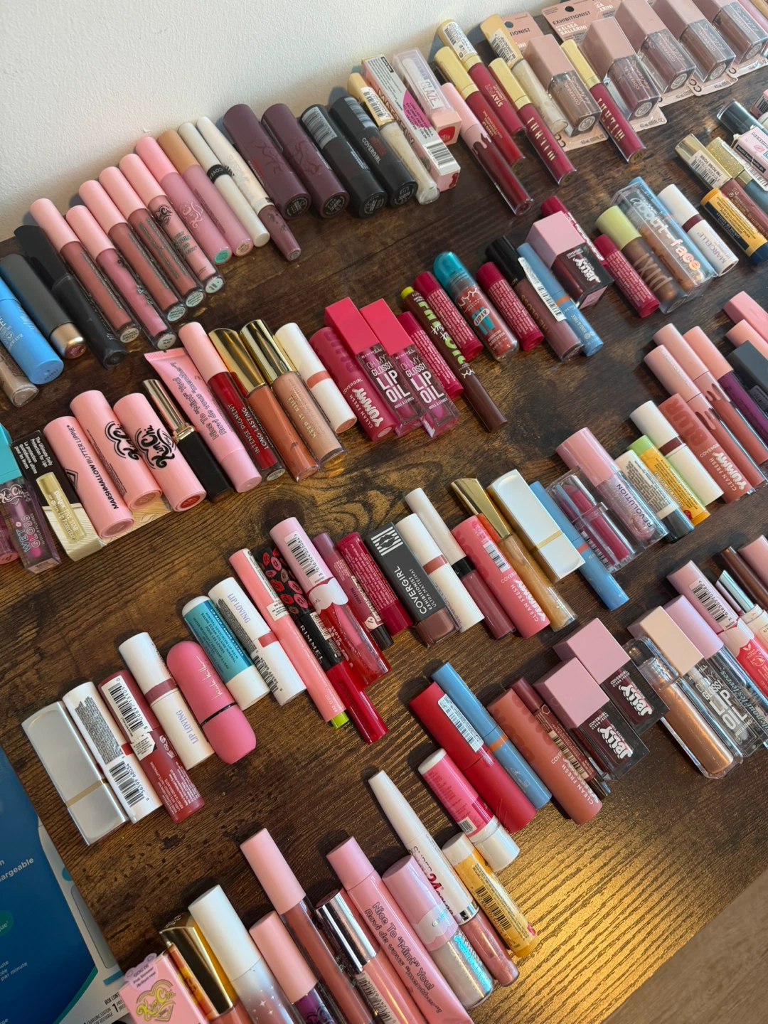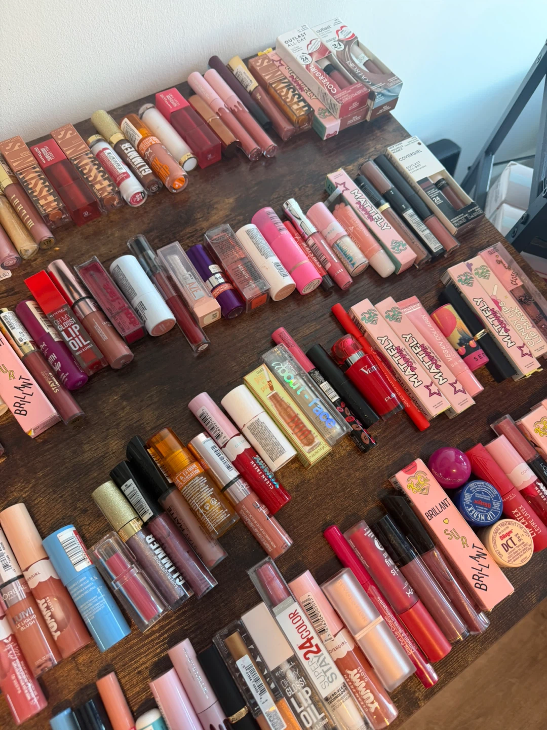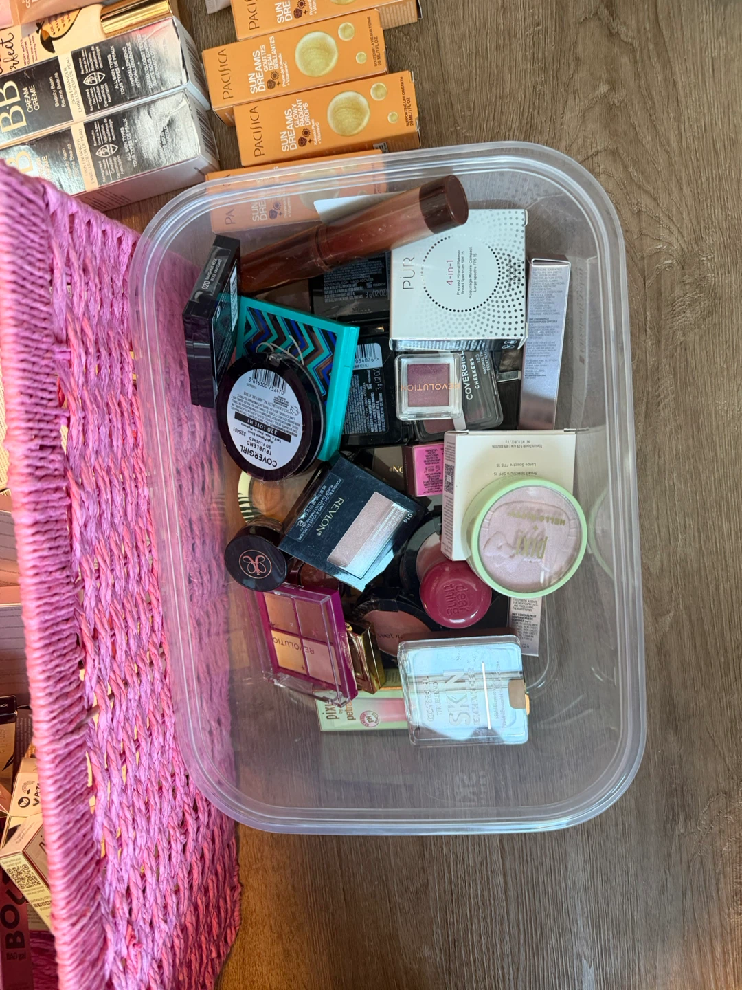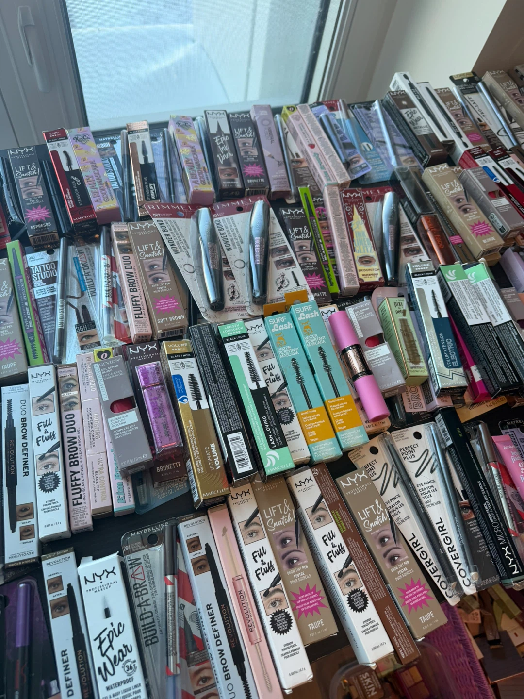 A large collection of makeup items including foundations, BB creams, lipsticks, and blushes from various brands. Includes popular names like NYX, Pacifica, Bobbi Brown, and Covergirl. Most items appear to be full-sized or generous samples. Great for makeup enthusiasts looking to try new products or stock up!