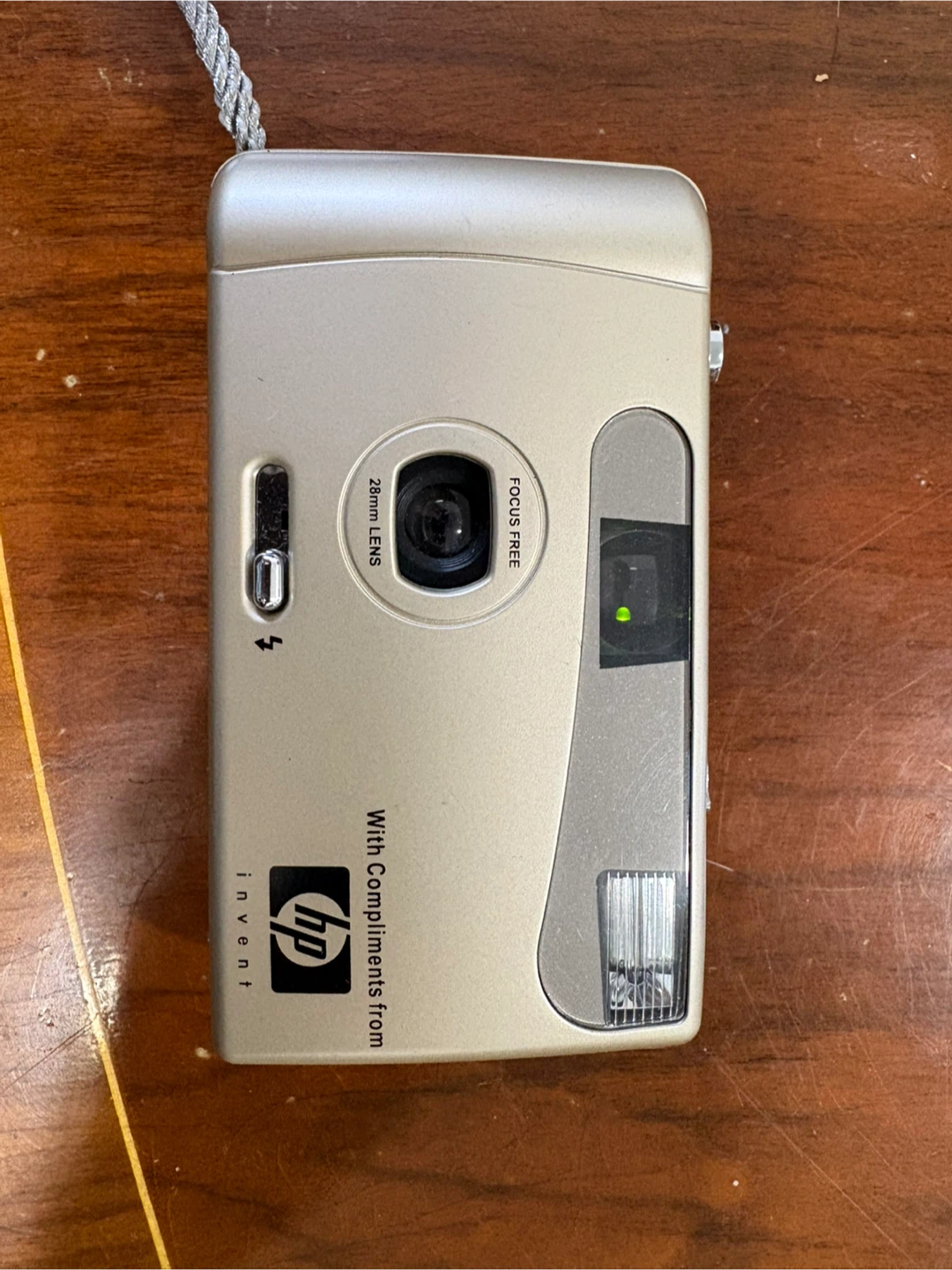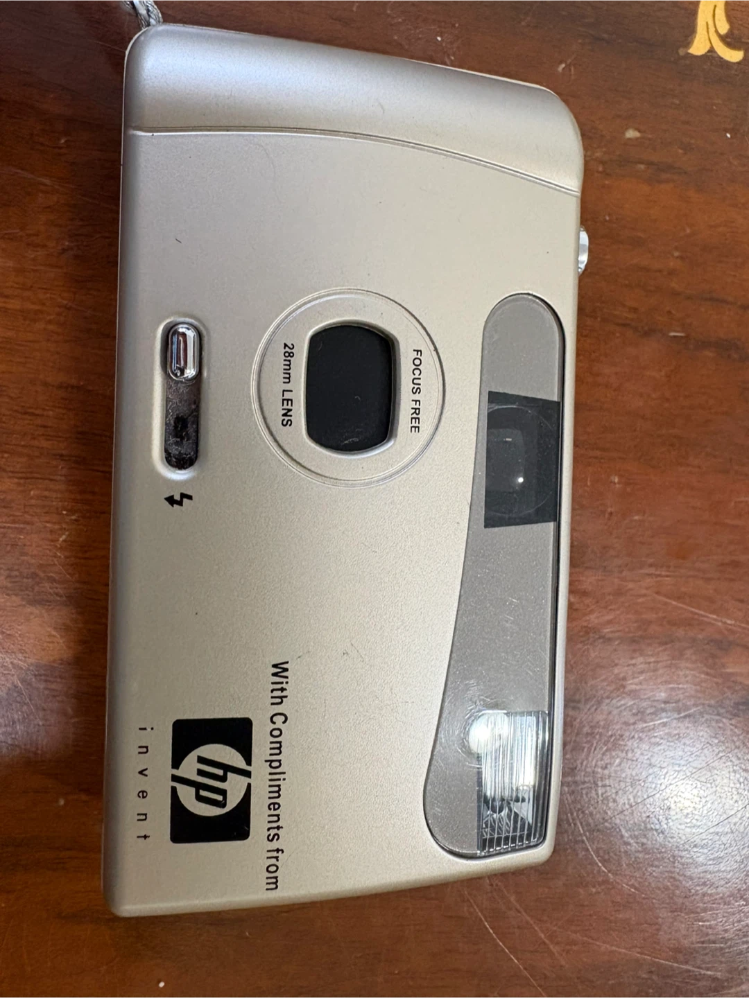 This is an HP Invent 35mm point and shoot camera with a 28mm lens. It's focus-free and includes a built-in flash. This camera is great for casual photography and capturing memories!