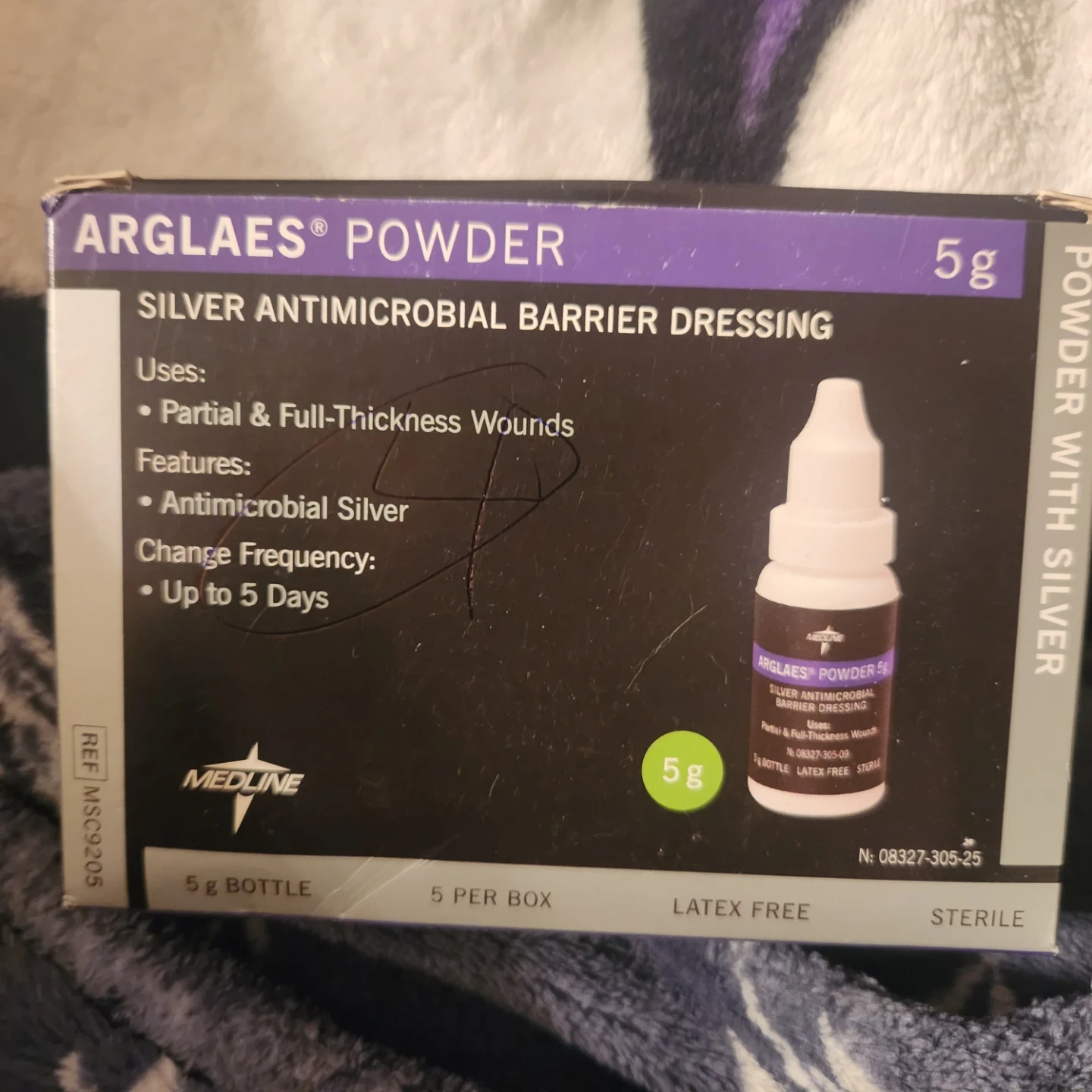 Medline Arglaes Powder is a silver antimicrobial barrier dressing. It's used for partial & full-thickness wounds. Includes 5 x 5g bottles. Latex free and sterile.