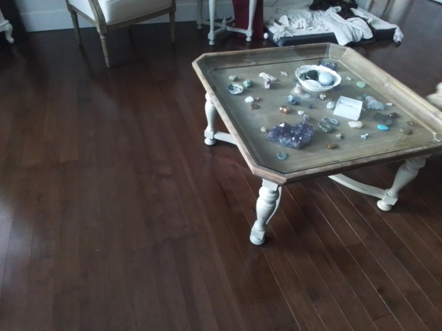 This is a charming wooden coffee table with a glass top. It's a great accent piece for your living room. The sturdy construction is built to last. Its classic design makes it suitable for many decor styles. Glass top was custom cut to use as display for rock collection only. Pier one original. Graige in colour.