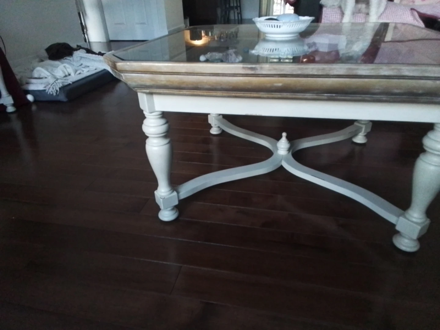 This is a charming wooden coffee table with a glass top. It's a great accent piece for your living room. The sturdy construction is built to last. Its classic design makes it suitable for many decor styles. Glass top was custom cut to use as display for rock collection only. Pier one original. Graige in colour.