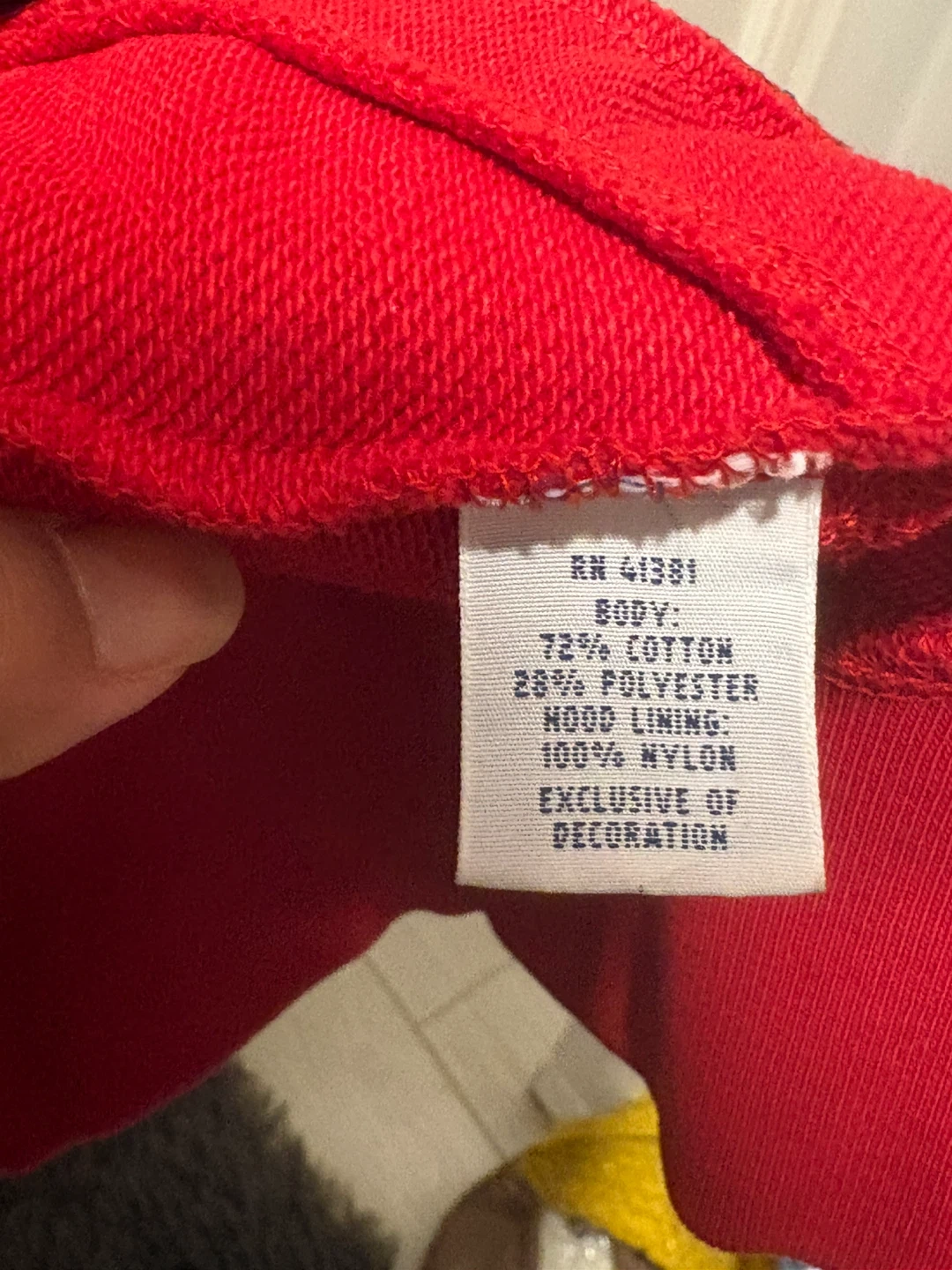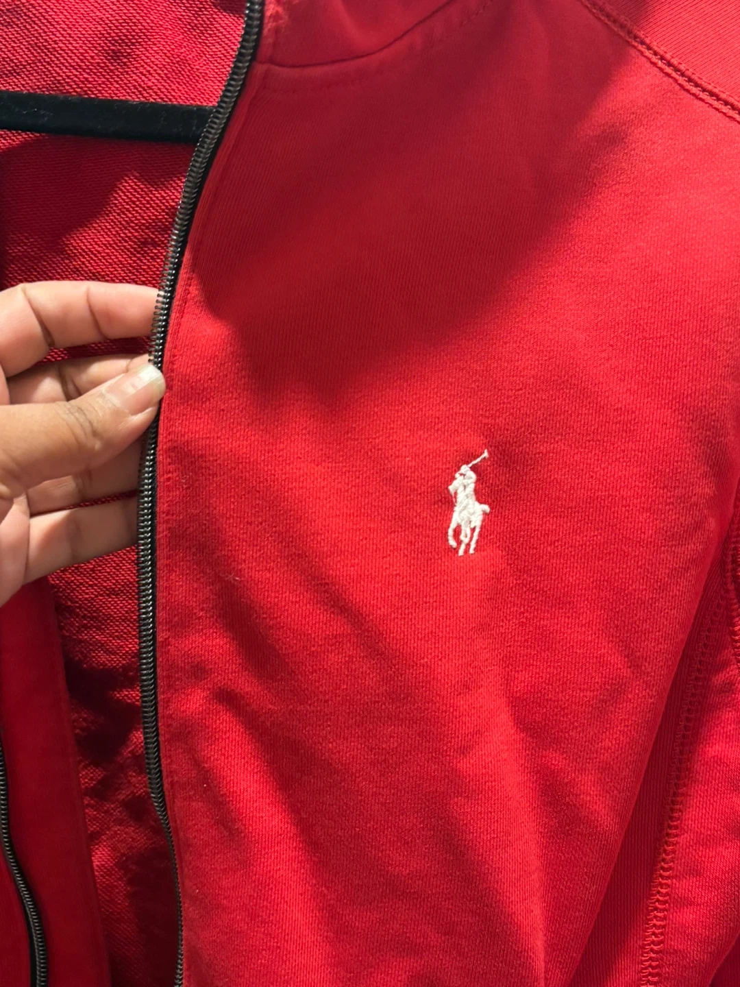 This is a red Polo Ralph Lauren zip-up hoodie. It's a size small with a blue hood lining. Body is 72% cotton and 28% polyester. Hood lining is 100% nylon.