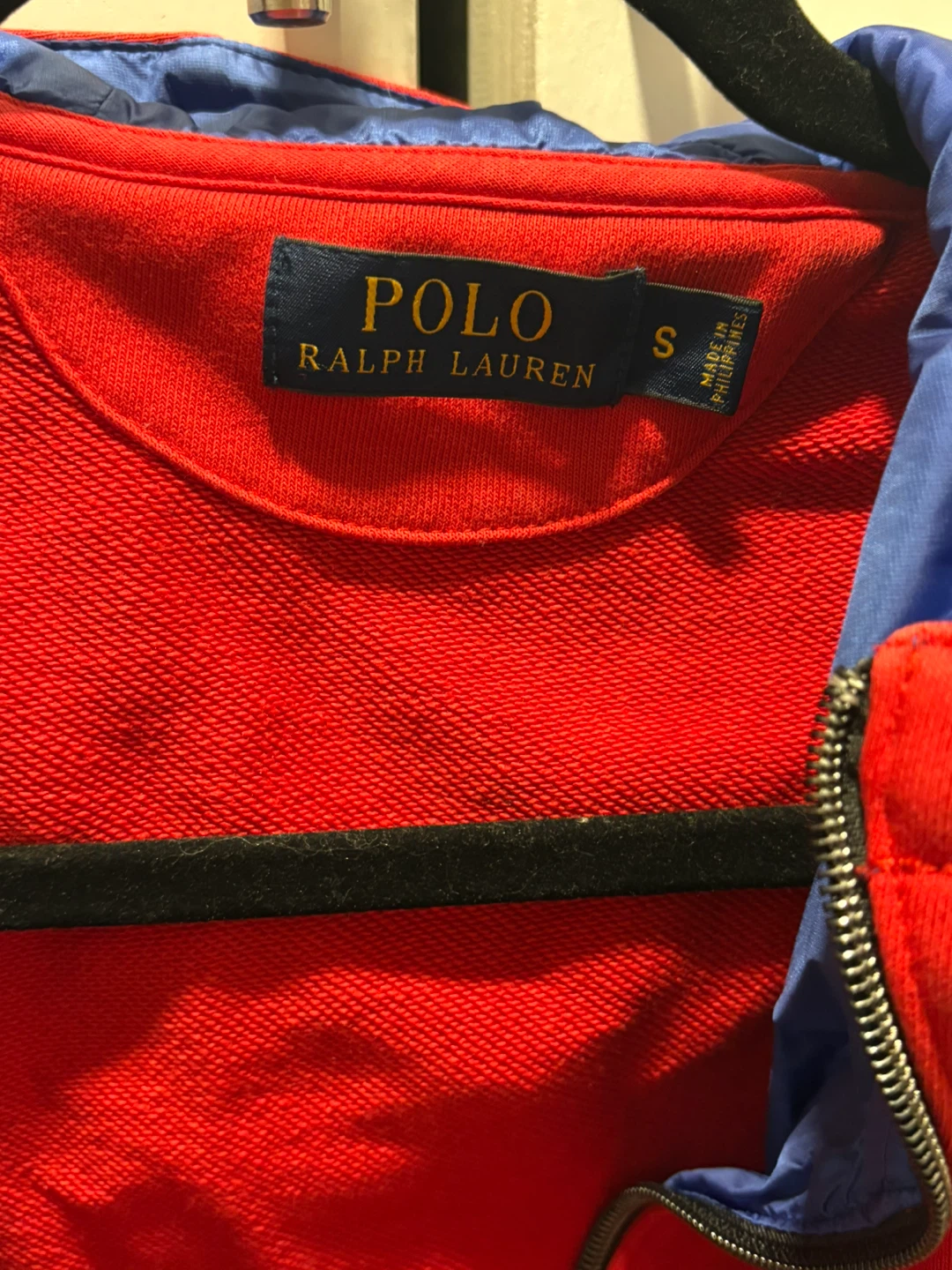 This is a red Polo Ralph Lauren zip-up hoodie. It's a size small with a blue hood lining. Body is 72% cotton and 28% polyester. Hood lining is 100% nylon.