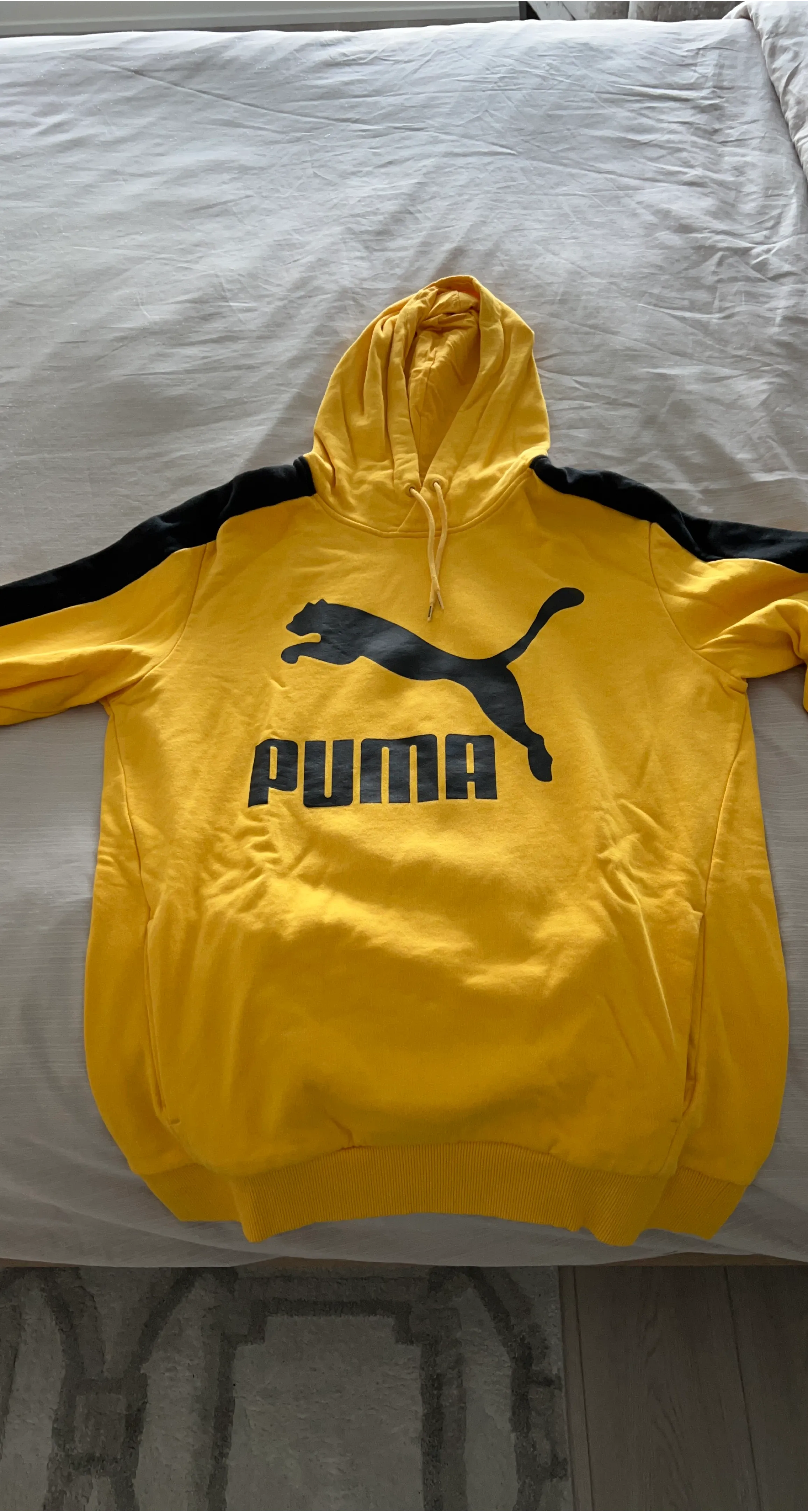 Yellow and black Puma hoodie with a large PUMA logo on the front. It's a comfortable hooded sweatshirt, perfect for casual wear. It has a drawstring hood and ribbed cuffs and hem. Wore maybe twice.