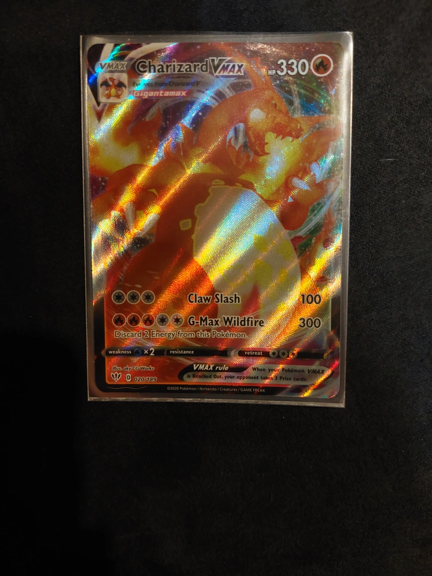 Selling a Charizard VMAX Pokemon card. It has a Gigantamax form and features attacks like Claw Slash (100) and G-Max Wildfire (300). A great addition to any collection!