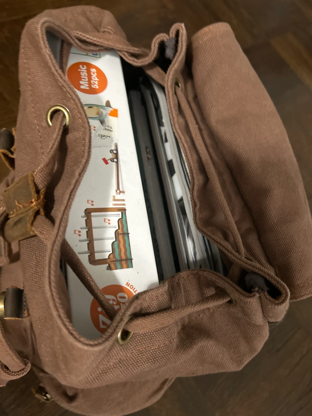 Here's a brown canvas backpack that's in great shape! It has a drawstring closure and several zippered pockets for all your essentials. Perfect for school, work, or just carrying your everyday items around town