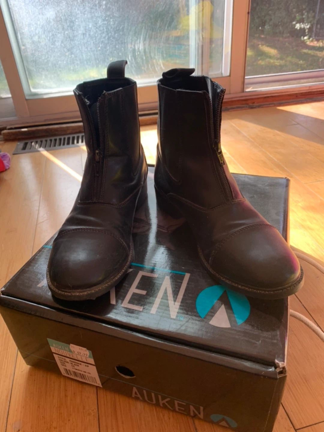 104Selling a pair of used Auken Nouvelle Paddock-Zip riding boots in black, size 5. They're in really good condition and come with the original box.