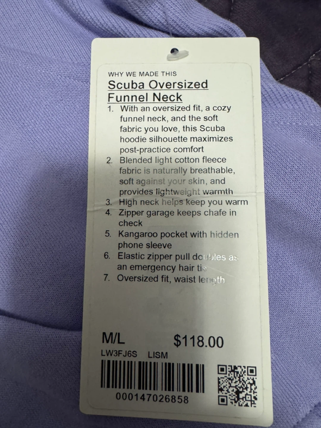 Selling a Lululemon Scuba Oversized Funnel Neck in size M/L. It's in brand new condition. The tag mentions it's designed with an oversized fit, a cozy funnel neck, and soft blended light cotton fleece fabric. It also features a kangaroo pocket with a hidden phone sleeve and an elastic zipper pull that doubles as an emergency hair tie.