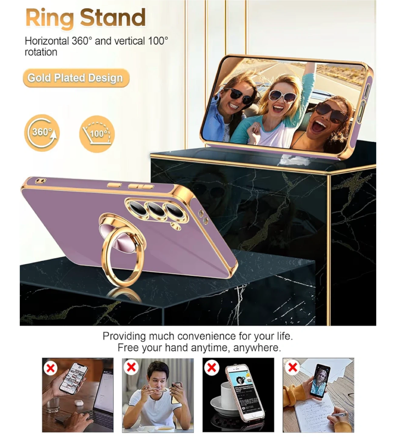 This Leyi phone case is designed for Samsung S24 FE and comes in a purple colour. It features a built-in metal kickstand and a gold-plated design for a stylish look. The ring stand allows for 360-degree horizontal and 100-degree vertical rotation, offering convenience for hands-free viewing. Not compatible with wireless charging.