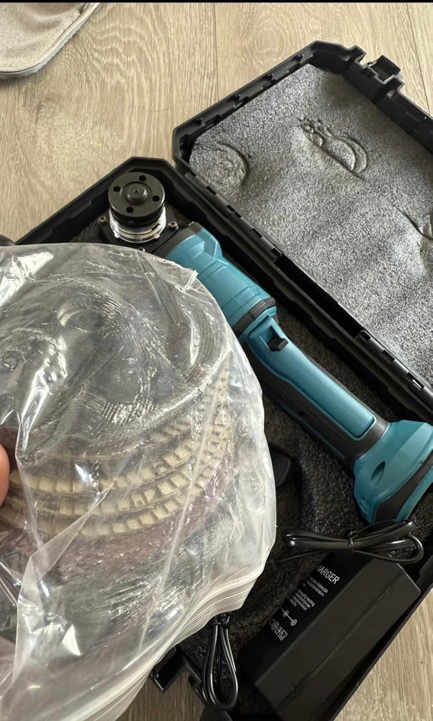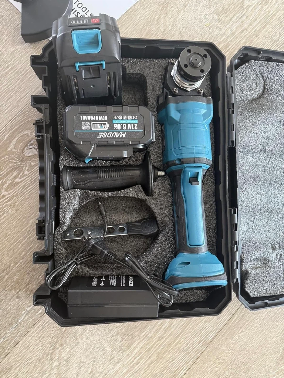 This angle grinder kit includes a 21V cordless tool, two batteries, a charger, and a case. It comes with various accessories and a side handle. It's ready for your projects!