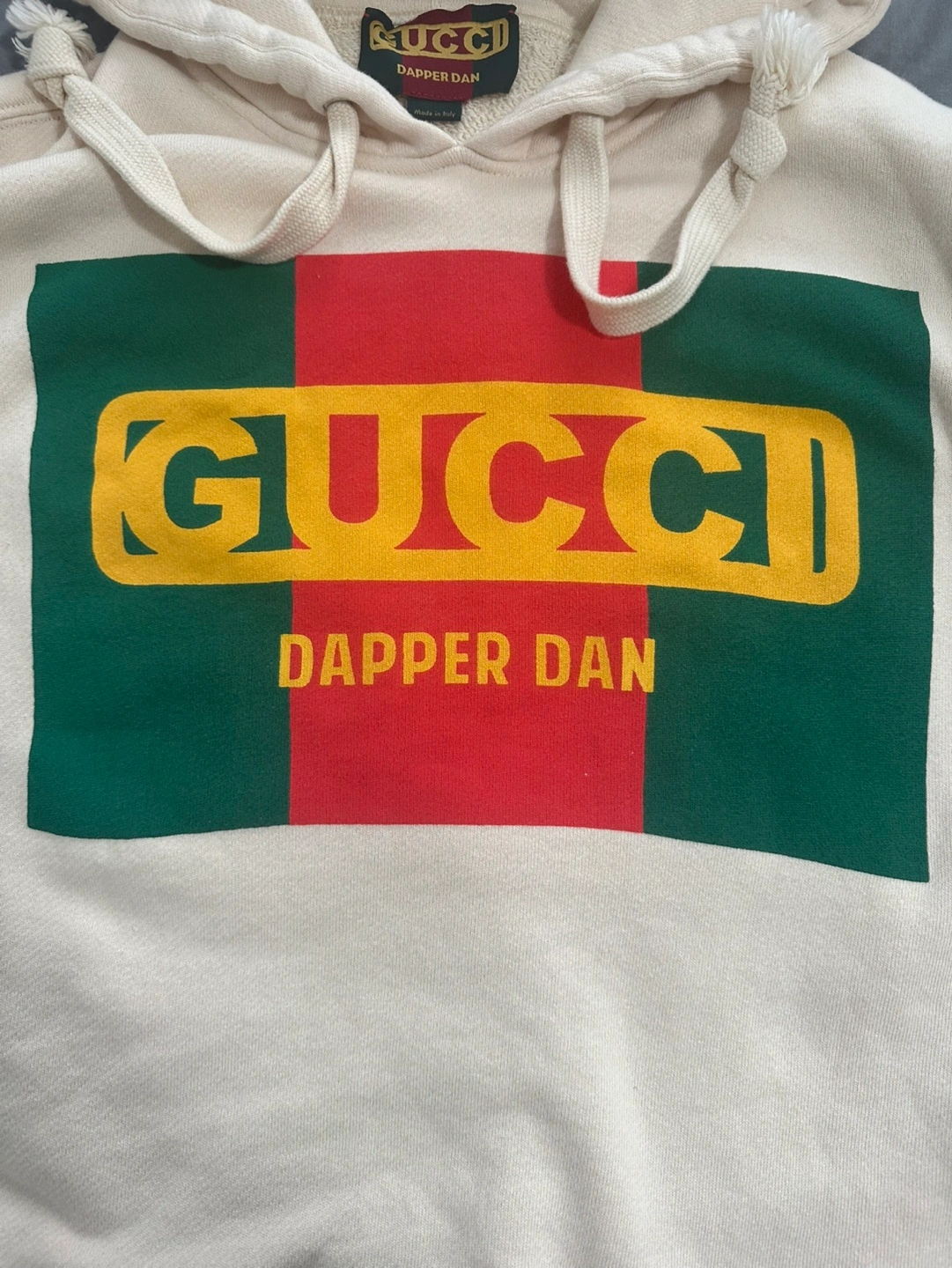 30Its 100% Aunthentic feel free to check it out❗️Cream-coloured hoodie. Features a large Gucci Dapper Dan logo on the front. Made in Italy. Long sleeves, drawstring hood. VARY RARE