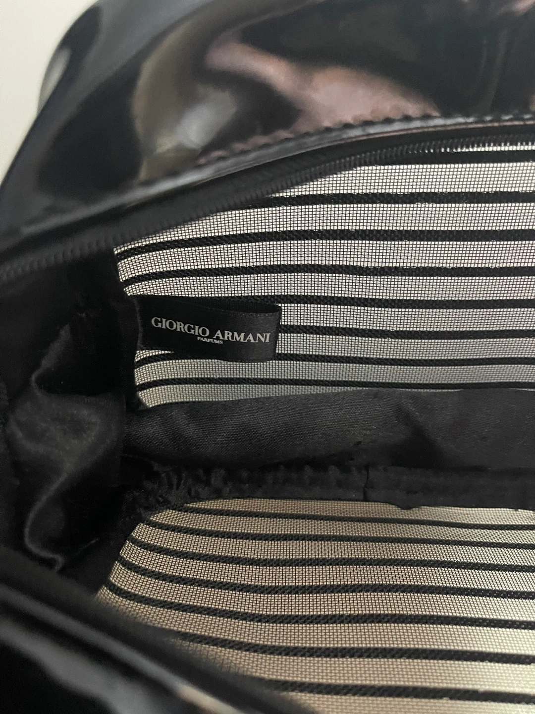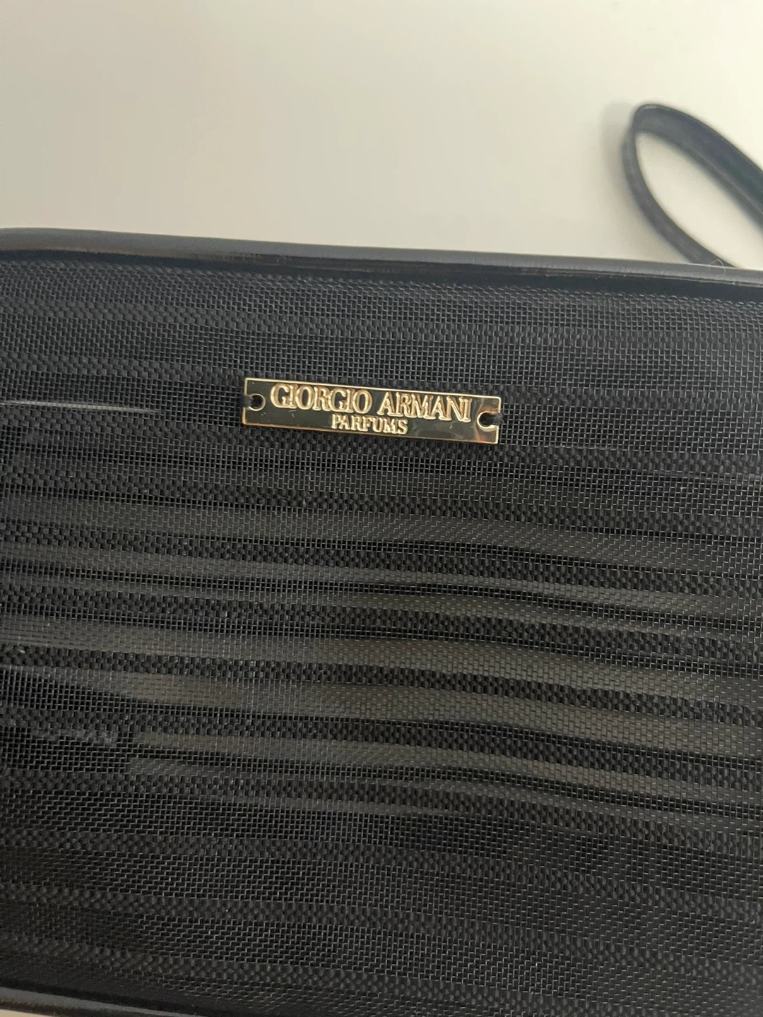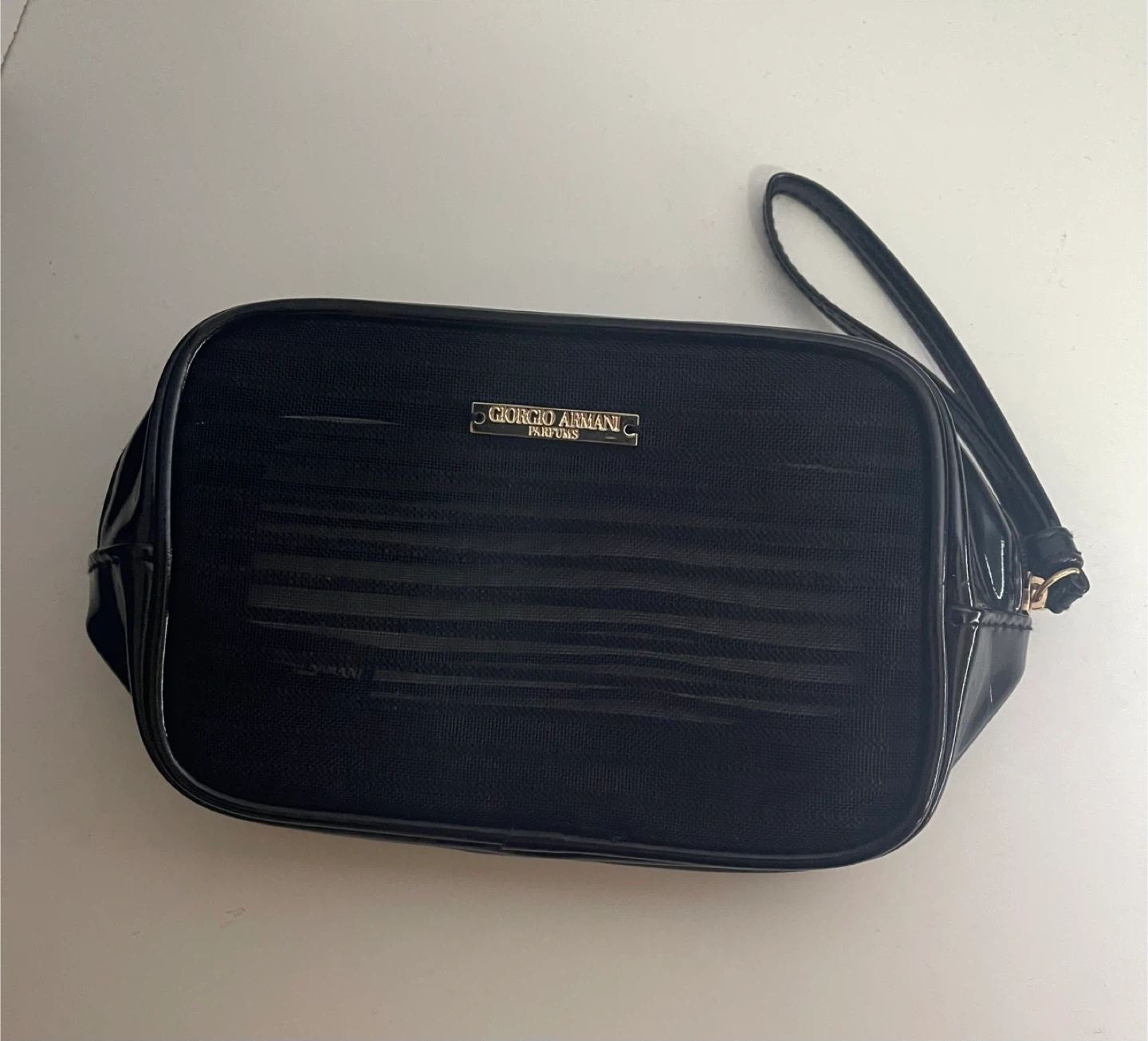 Giorgio Armani vanity bag in black. It's in great shape and perfect for storing your makeup and toiletries. The bag features the Giorgio Armani Parfums logo.