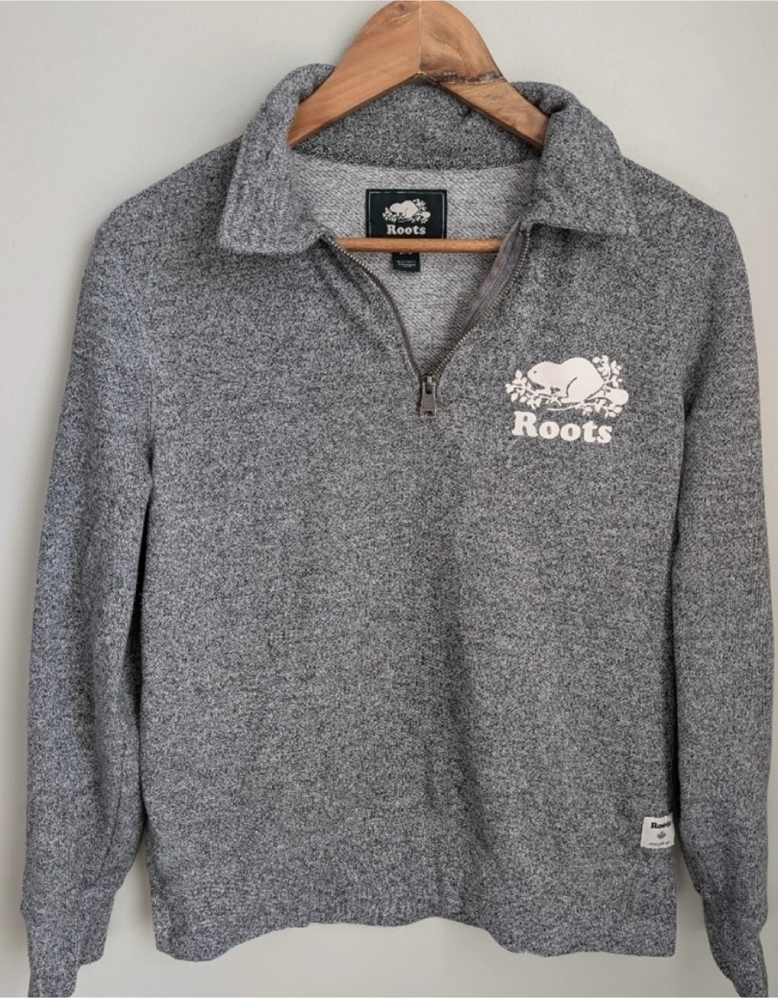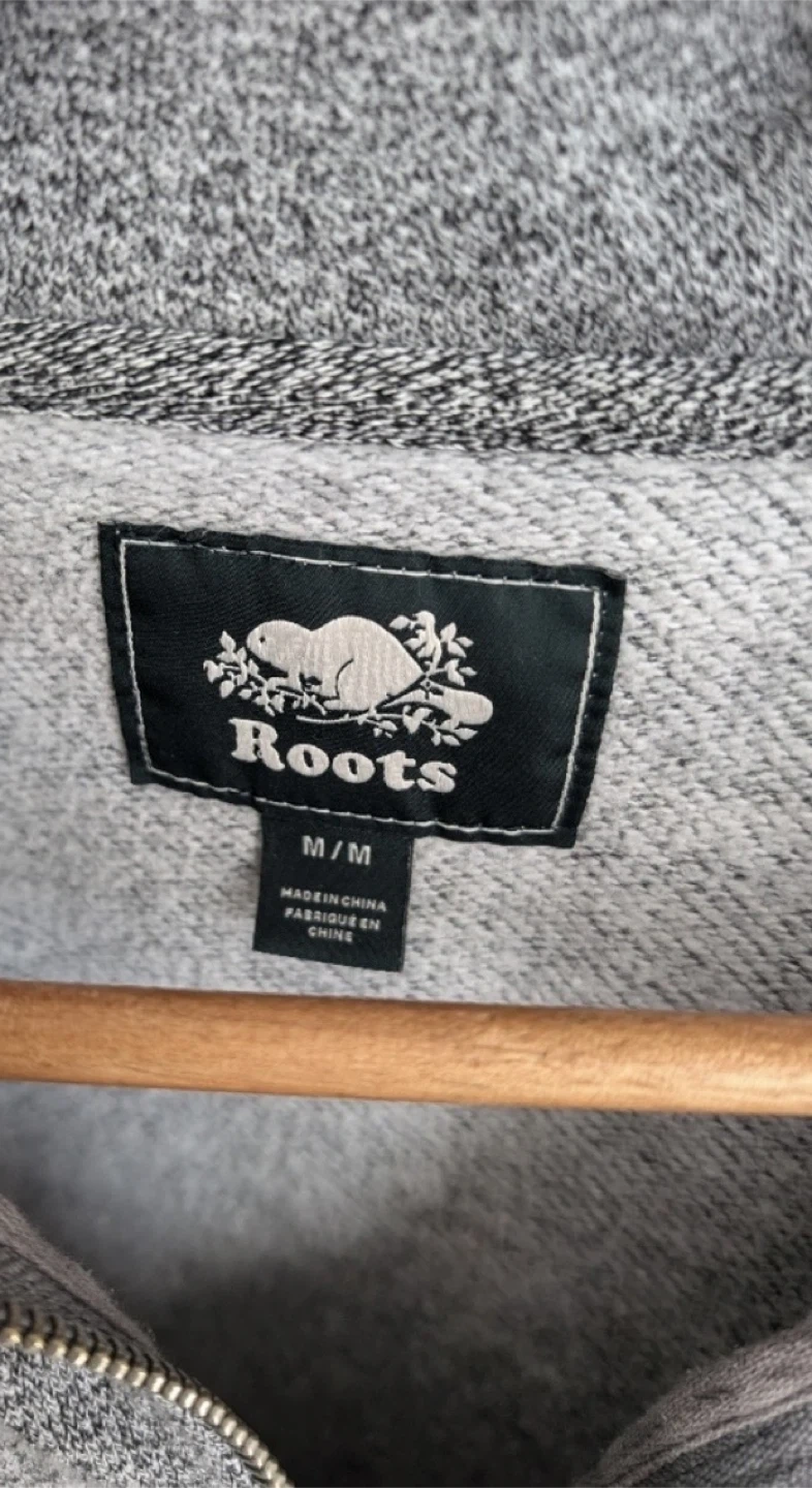Roots quarter zip sweatshirt in a charcoal grey colour. Size Medium. It's a cozy layering piece.