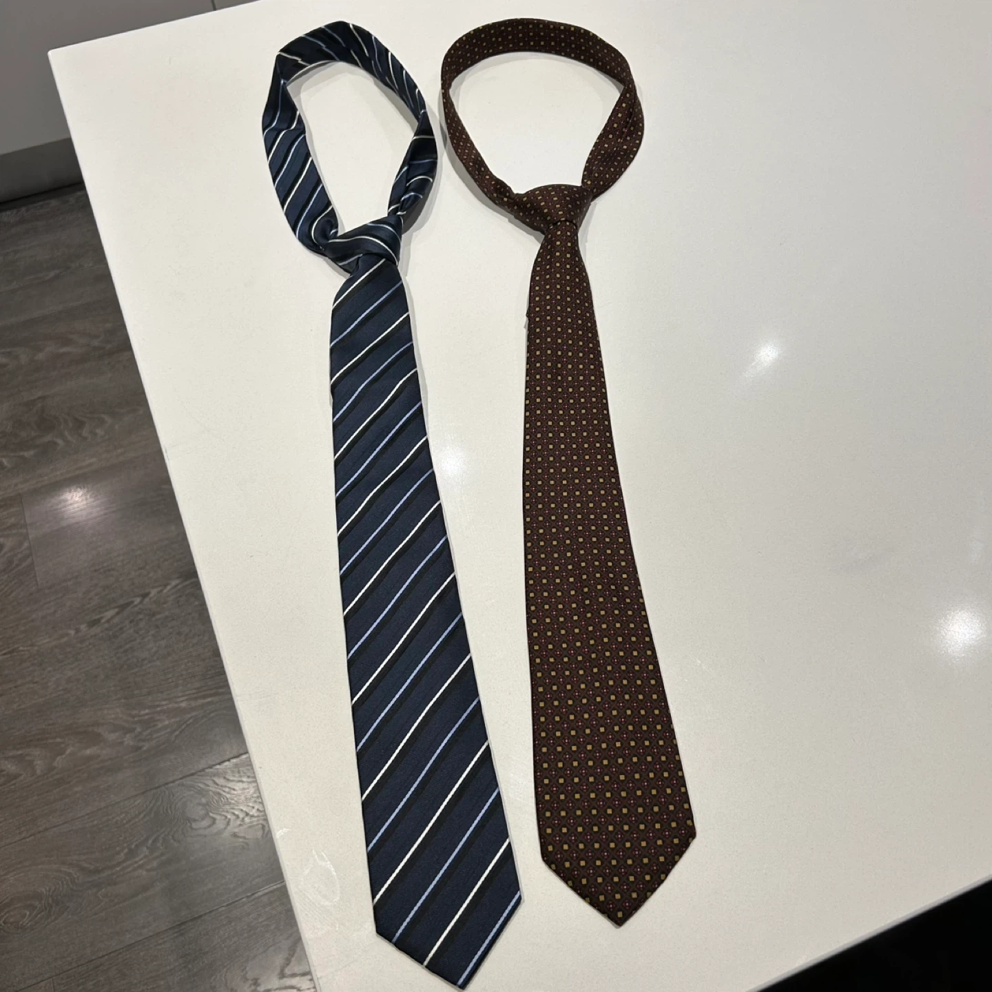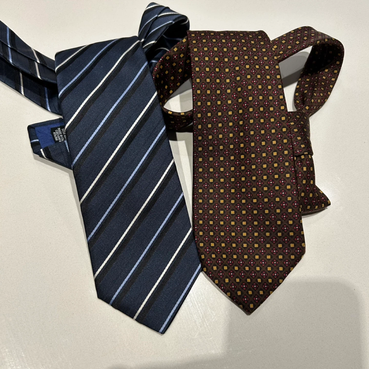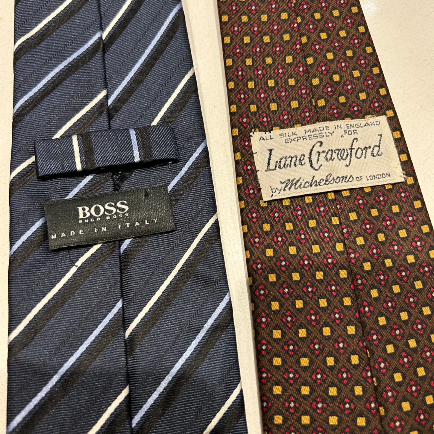 Two neckties, one blue with stripes and the other brown with a patterned design. The blue tie is 100% silk and made in Italy. The brown tie is also silk and made in England for Lane Crawford by Michelsons of London.