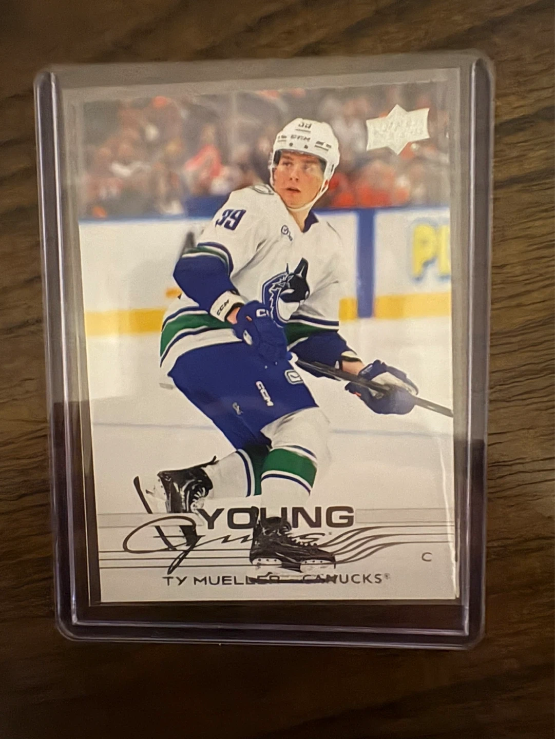 This is a 2025-26 Upper Deck Series 2 Hockey card featuring Ty Mueller. It's a Young Guns rookie card for the Vancouver Canucks. The card is in a sleeve and top loader, and is in mint/near mint condition