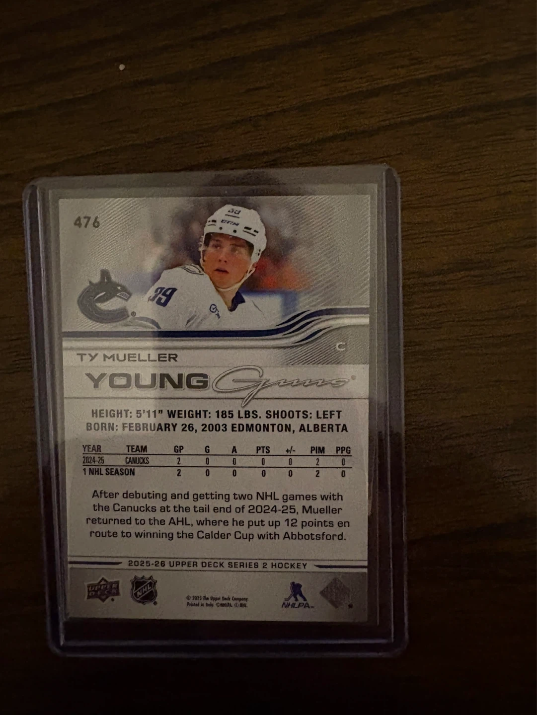 This is a 2025-26 Upper Deck Series 2 Hockey card featuring Ty Mueller. It's a Young Guns rookie card for the Vancouver Canucks. The card is in a sleeve and top loader, and is in mint/near mint condition
