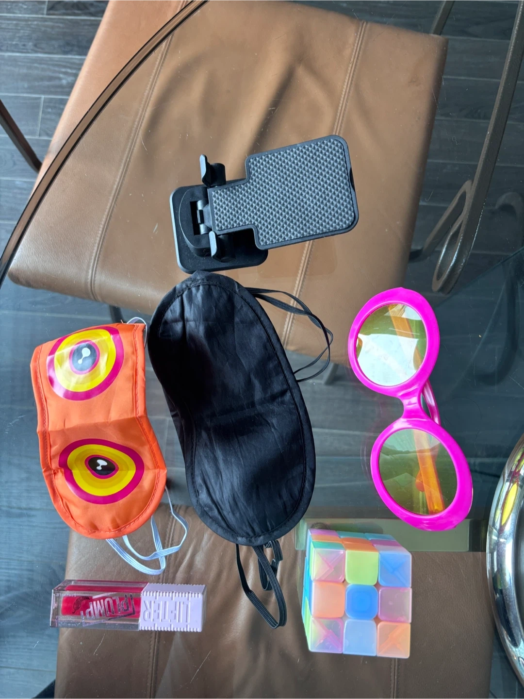 Bundle of fun novelty items including a black sleep mask, a colourful graphic eye mask, a pink oversized pair of novelty sunglasses, a Rubik's cube, a lip plumper, and a phone holder.