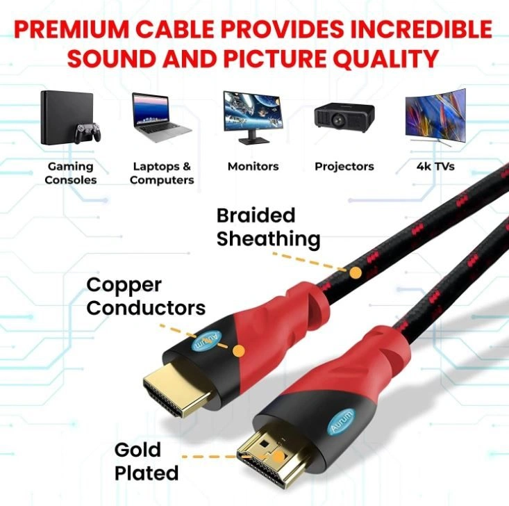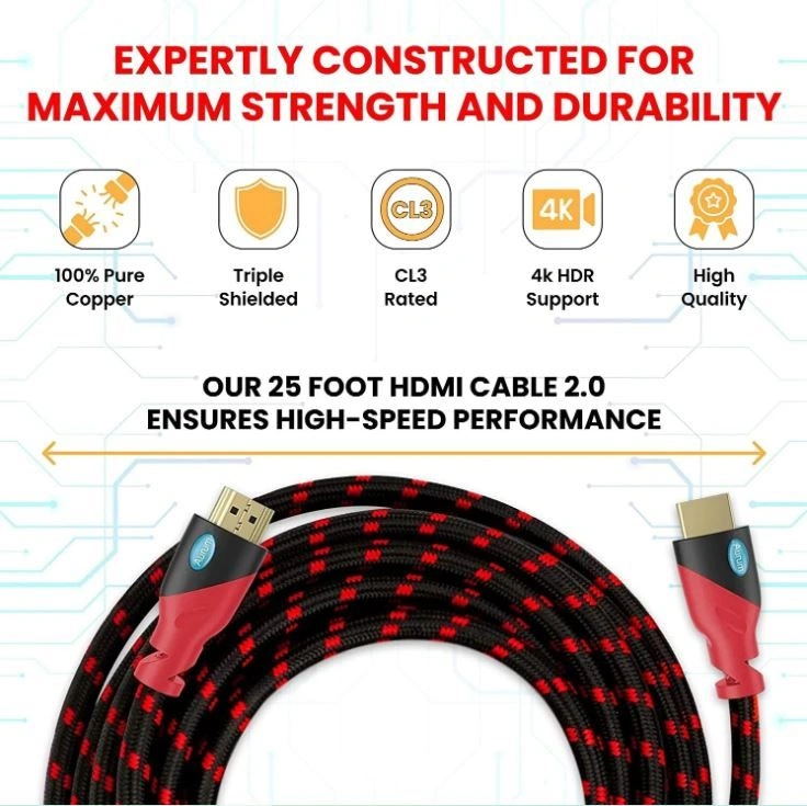 12High-Performance Long HDMI Cable -Aurum Ultra HDMI 25 Inch long arc cable is designed for sharper images on your flat-screen TV, home projector, monitor, or computer. Universal Compatibility - High speed HDMI cable is compatible with Blu-ray player, AV receiver, Apple TV, cable box, Play Station 3, Play Station, Xbox One, 360, Nintendo Wii, Wii U, TrueHD 7.1, Audio Return Channel (ARC). Heavy-Duty Yet Flexible Cord - Our CL3 rated HDMI 4K cable is built to last with triple shielded 100% pure copper conductors with a braided jacket and gold plated connectors for stable signal transmission.