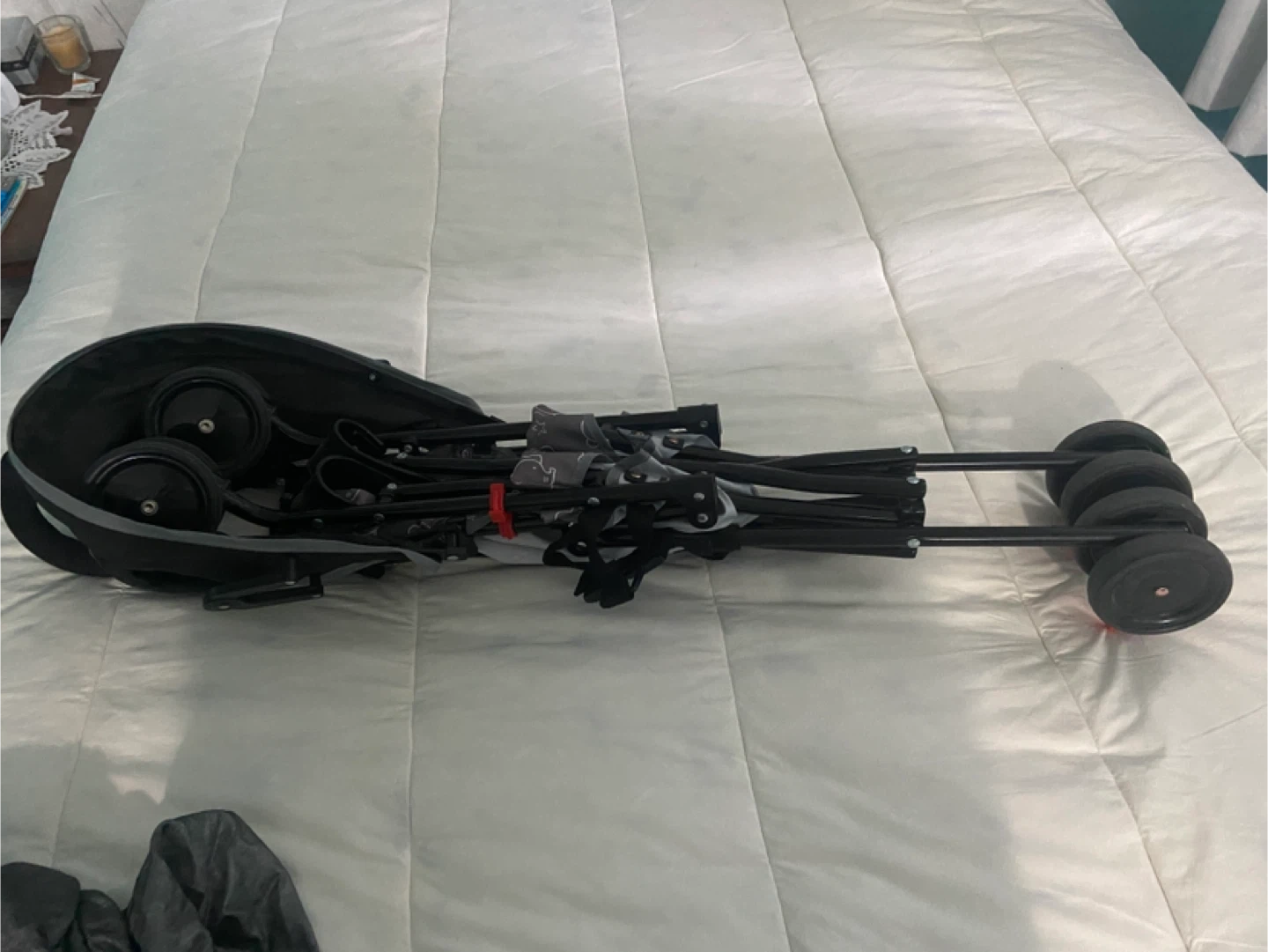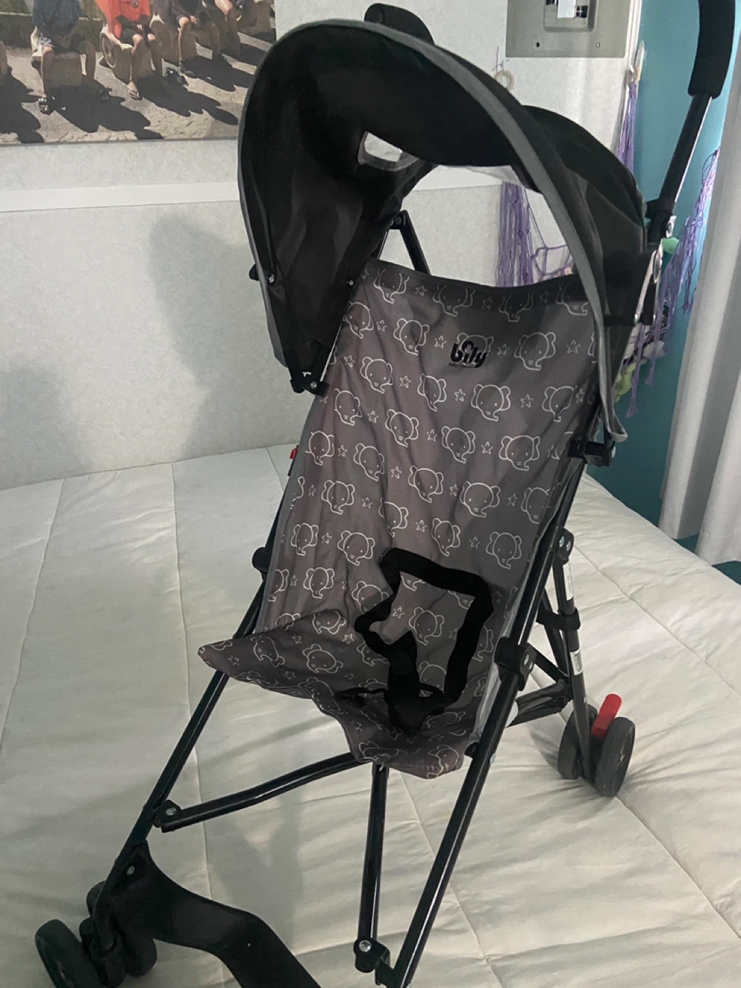 This is a compact baby stroller with a cute elephant pattern. It's lightweight and easy to fold for on-the-go convenience. Perfect for quick trips out and about! Has sun/bug cover. Hardly used.