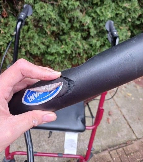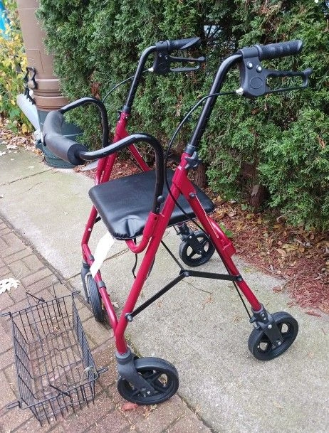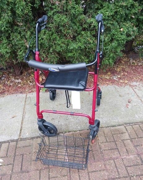 This Invacare rolling walker with a seat and basket is in great condition. There is a large cut on the handle cushion from improper storage, but it can likely be replaced or repaired with glue. Otherwise, it works great. This upright walker allows users to walk and stand up, promoting proper posture and relieving back, shoulder, and neck pain. It enables you to look forward instead of down, making it safer and more comfortable. This folding rollator for seniors helps increase independence and mobility, giving you the confidence to walk further.