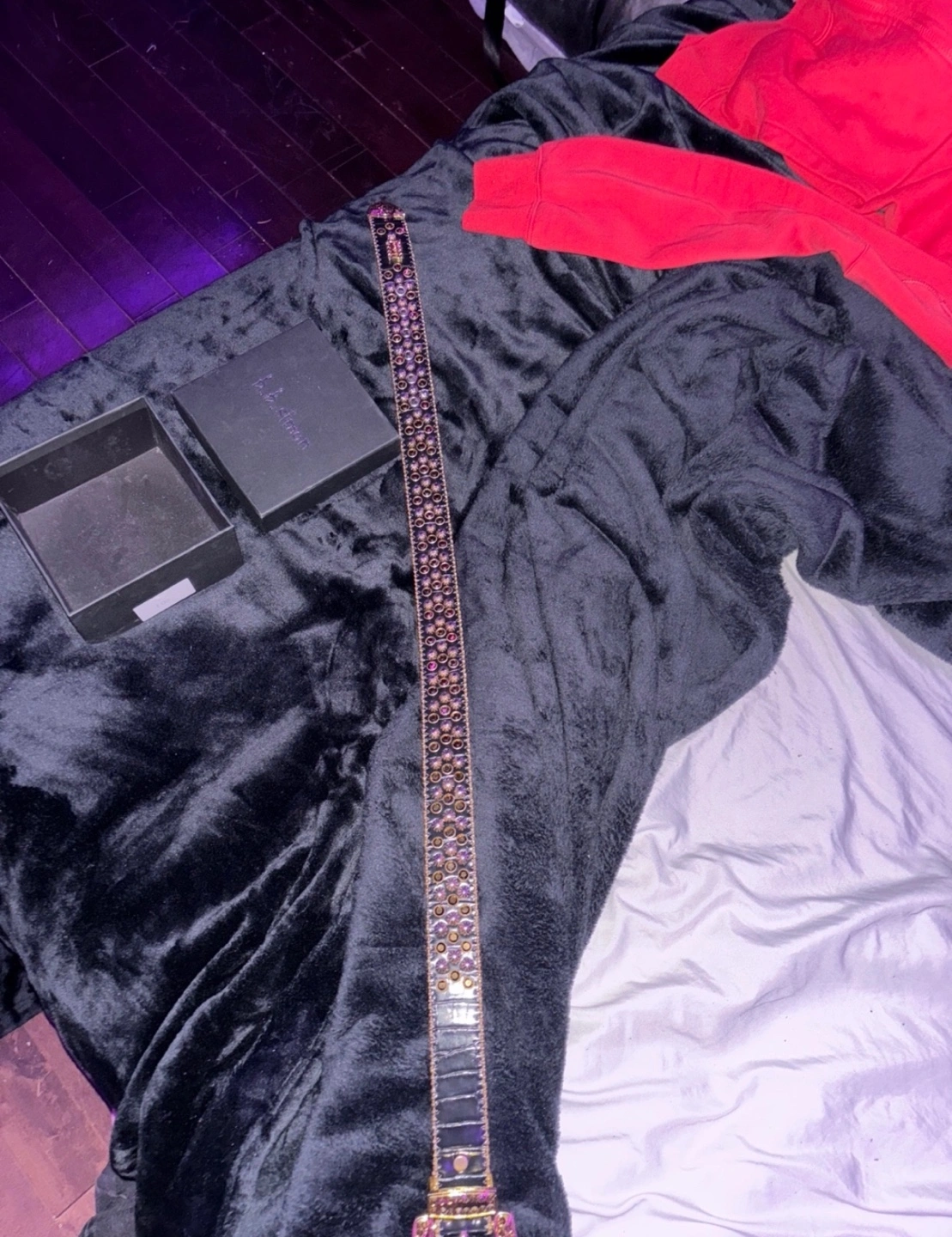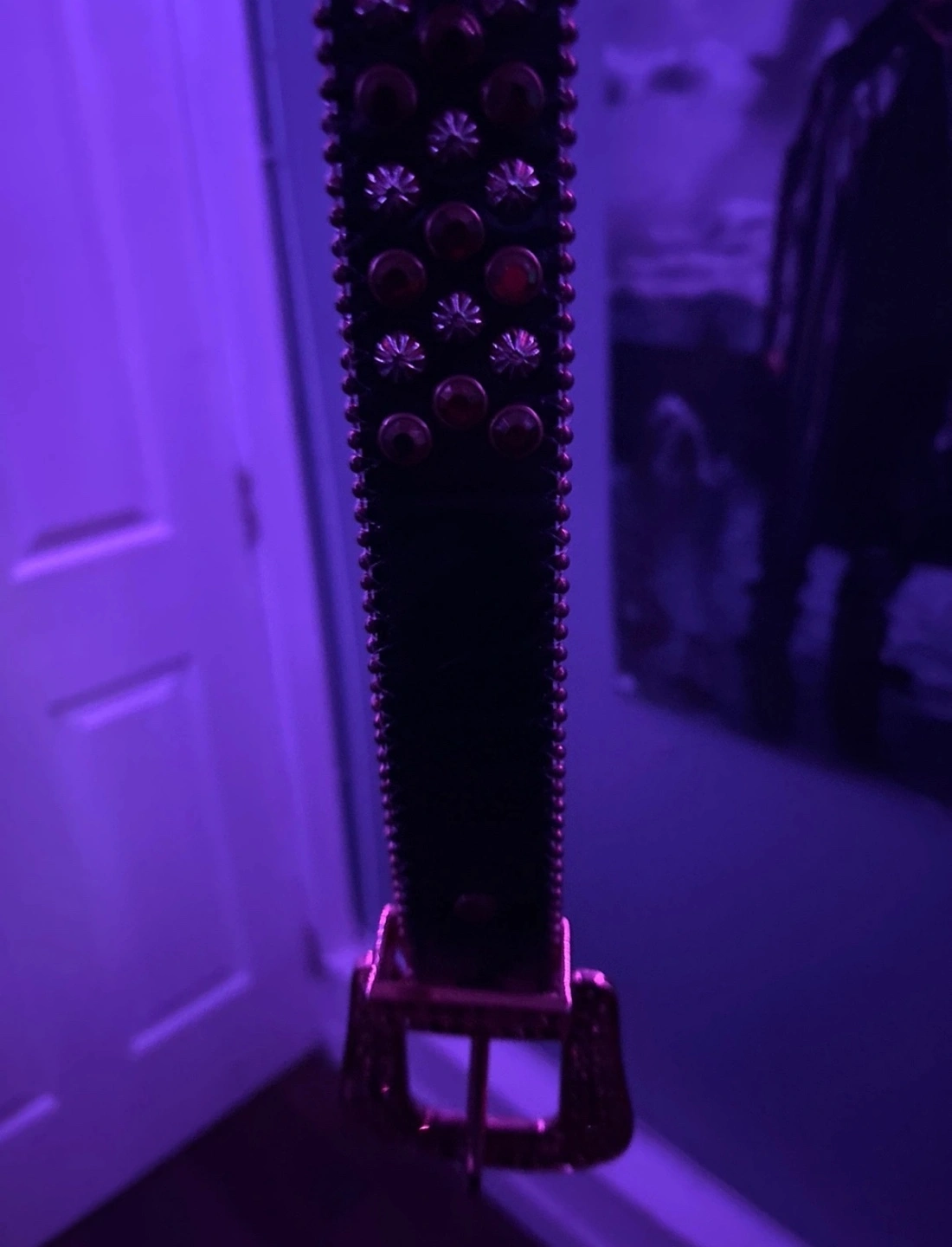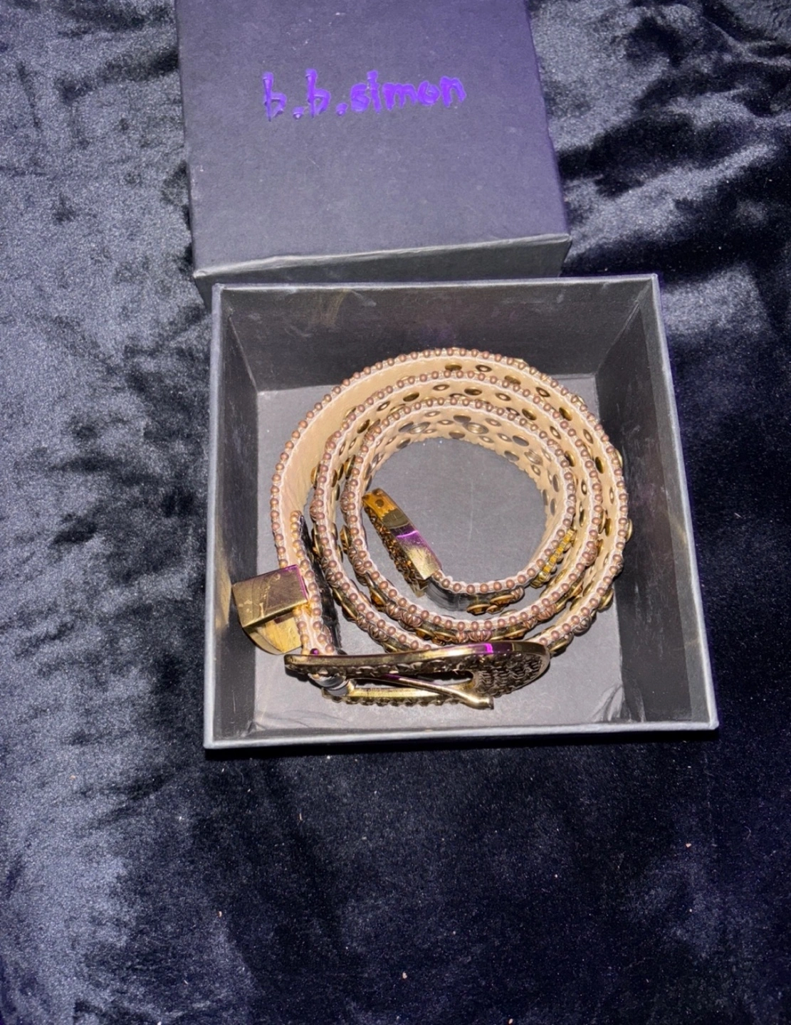 34Genuine leather studded belt. Gold-tone buckle. Comes in original box.