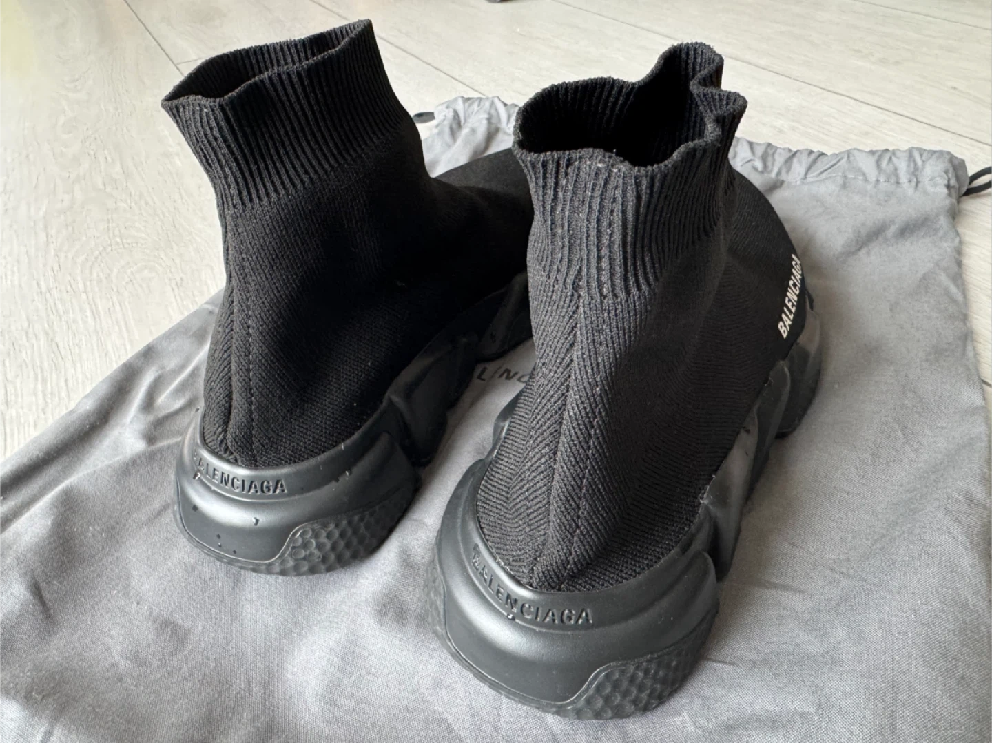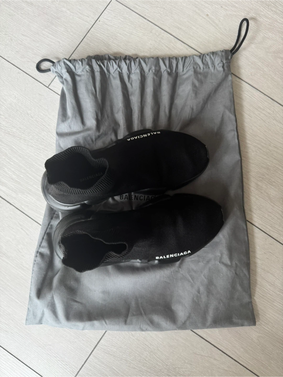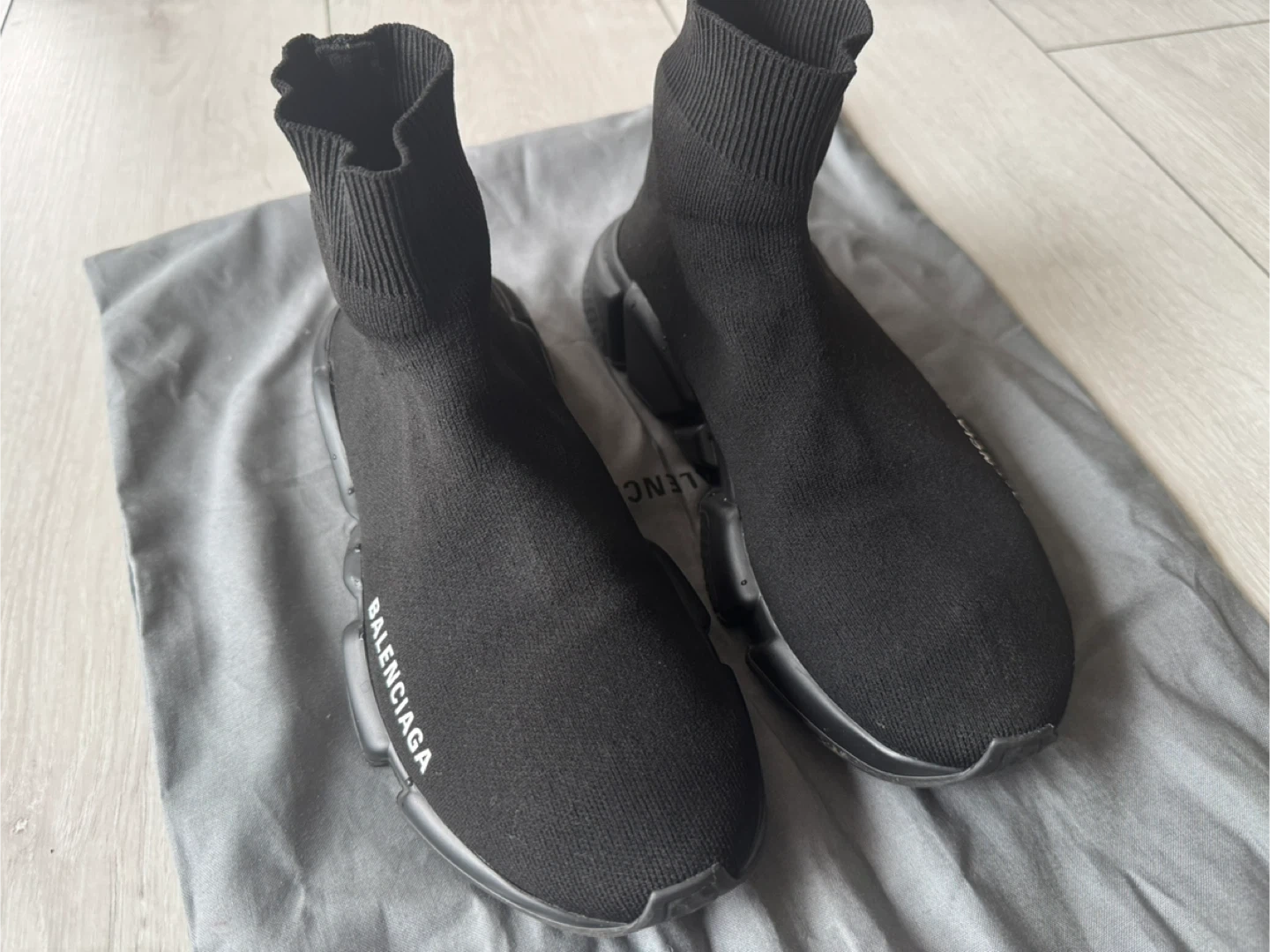 Selling a pair of Balenciaga Speed 2.0 sneakers in black. These are a stylish and comfortable knit sock-style sneaker. They are in good condition and come with the original dust bag!