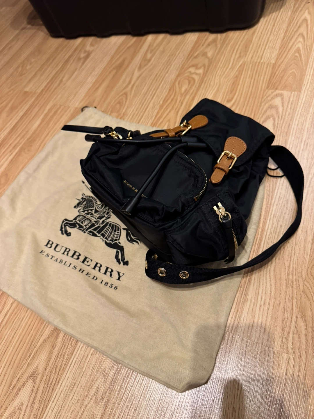 81Selling a stylish Burberry backpack in black nylon. The backpack has brown leather buckle straps and gold-tone hardware. Comes with the original dust bag!