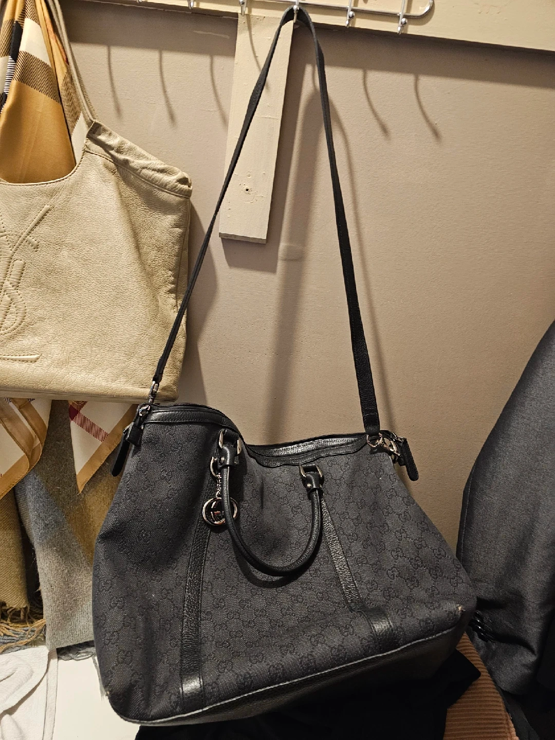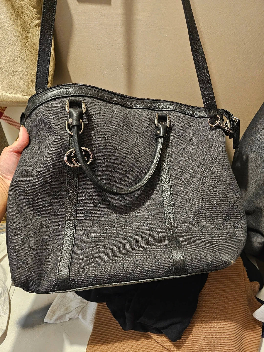 94Selling a Gucci handbag in black. It shows some signs of wear on the corners, but is otherwise in good condition. It's a stylish bag and perfect for everyday use! can fit a 13" laptop. No longer using and it's just sitting in my closet.
