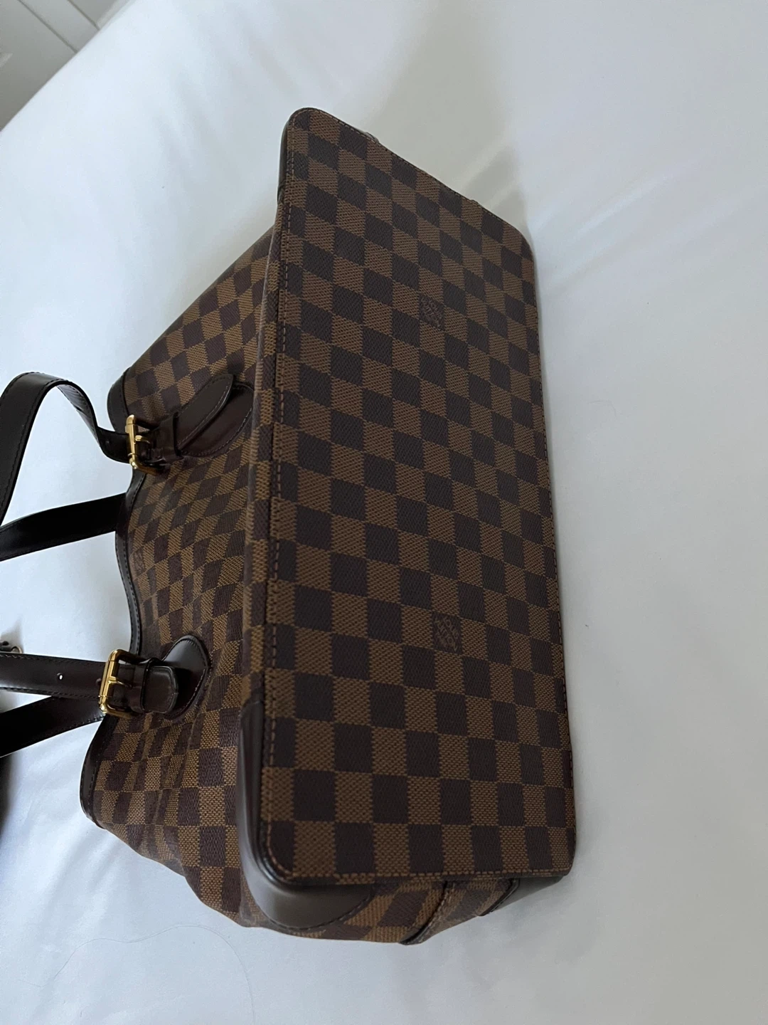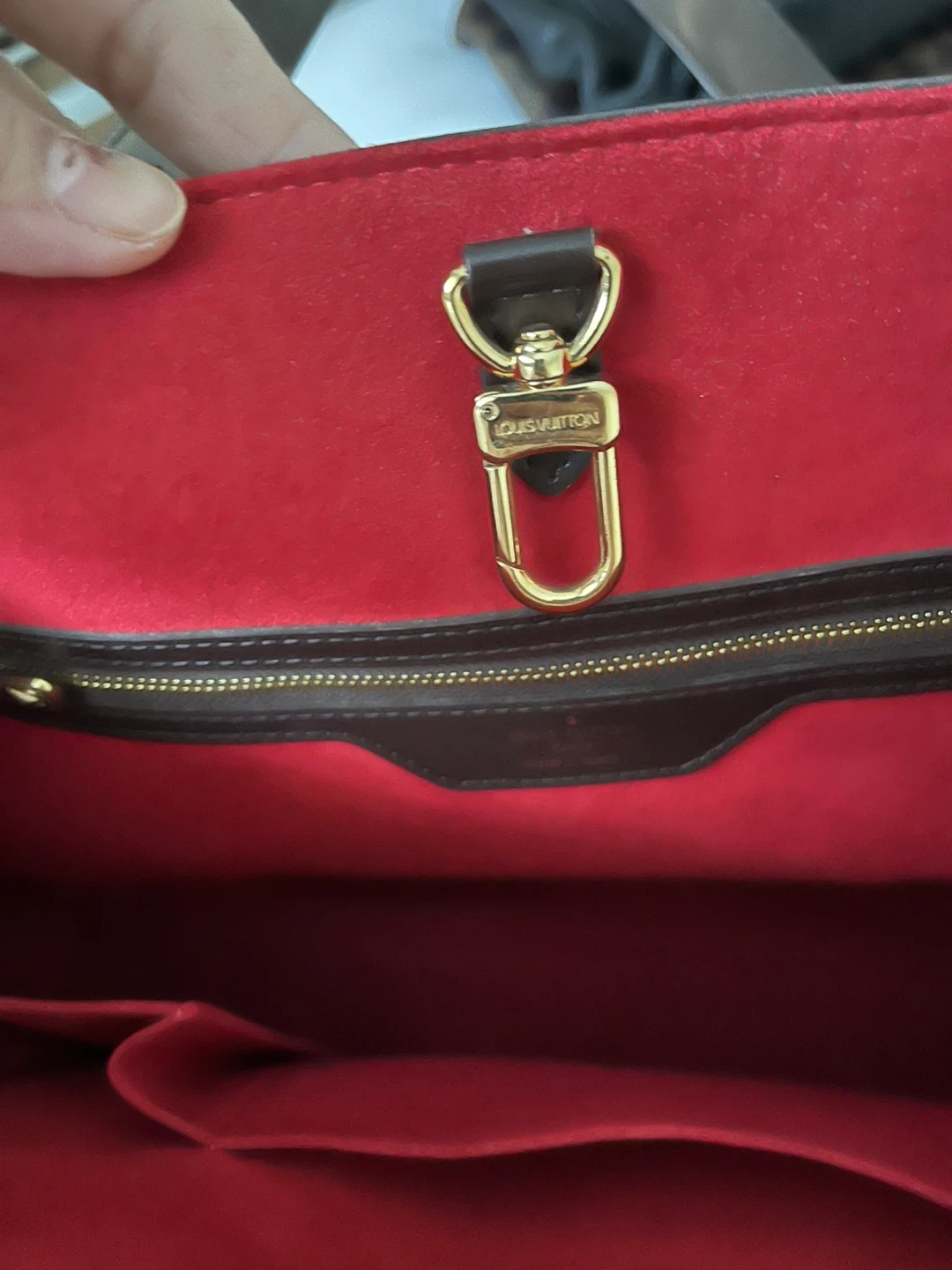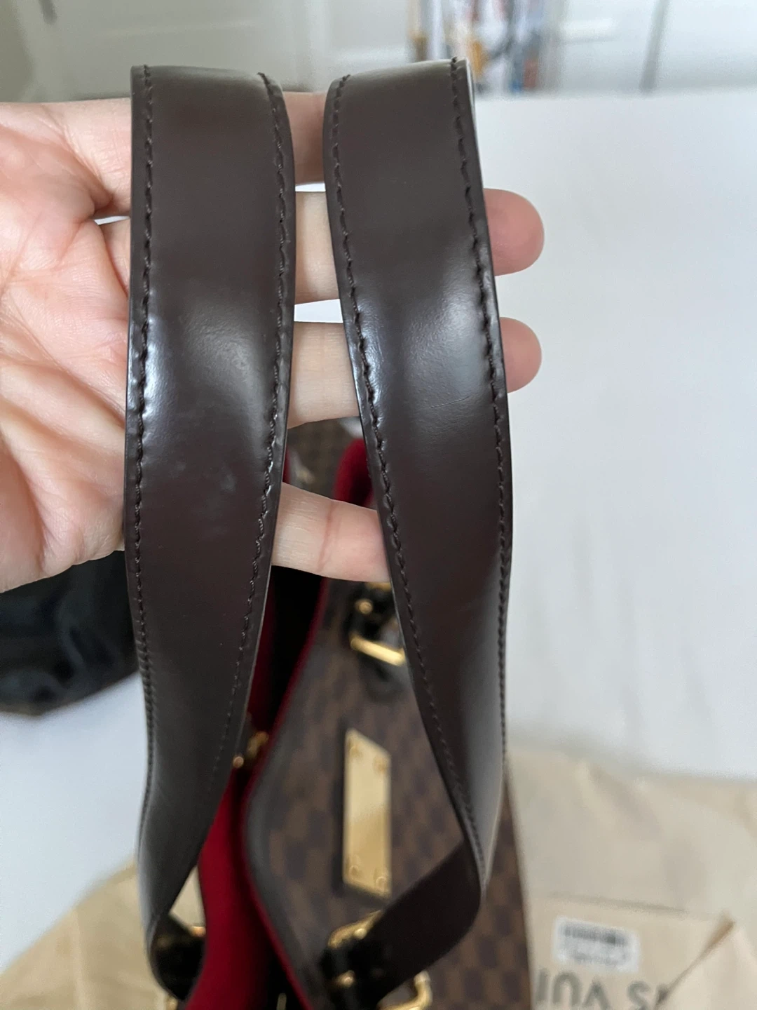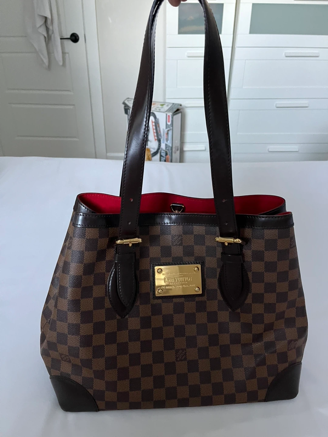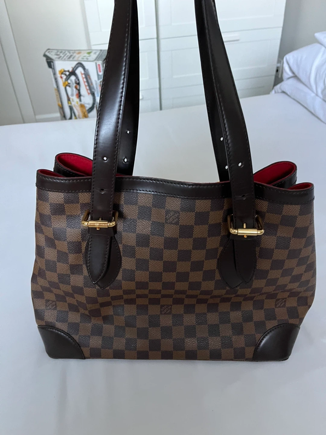 Selling my AUTHENTIC PRE LOVED Louis Vuitton Damier Ebene Hampstead MM tote bag. It features the classic brown checkered pattern with a red interior. The bag is in great condition and ready for a new home!