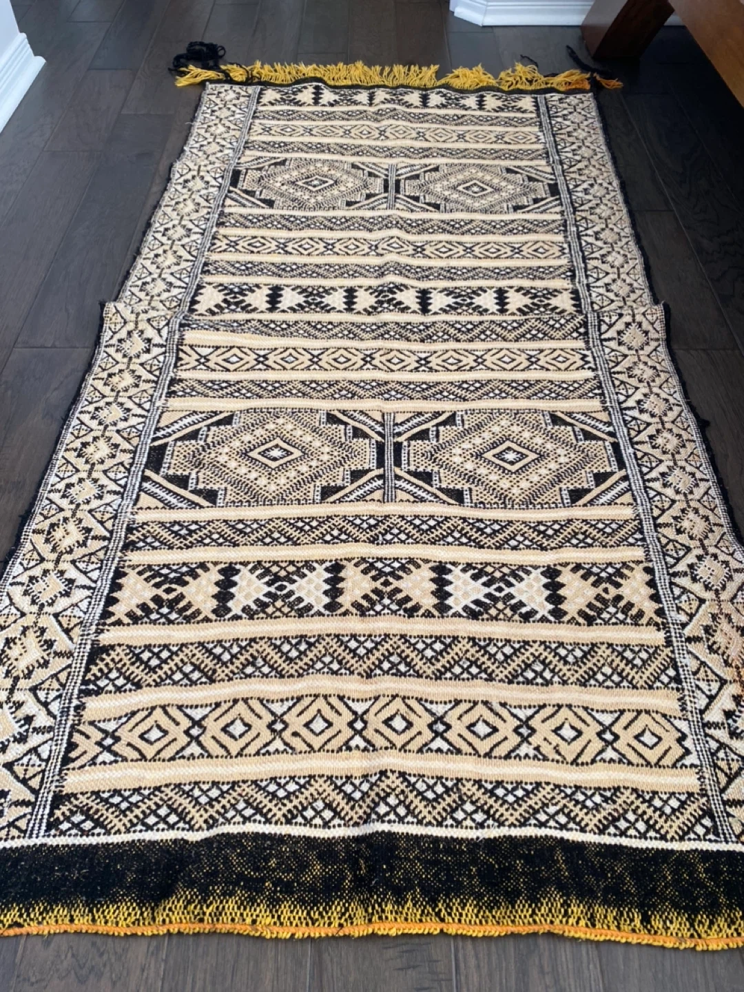 Selling a Moroccan carpet that I purchased and imported from a market in Fes, Morocco. It is hand woven and was made locally. The stitching is more complex and detailed giving it higher value. It is in perfect condition and was never used on the floor. Has been stored in a clean, dry space since purchased. Unfortunately, I must sell because I moved to a smaller condo and no longer have space. Measurements: 36 in x 72 in