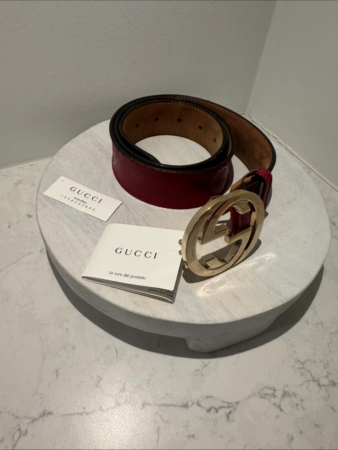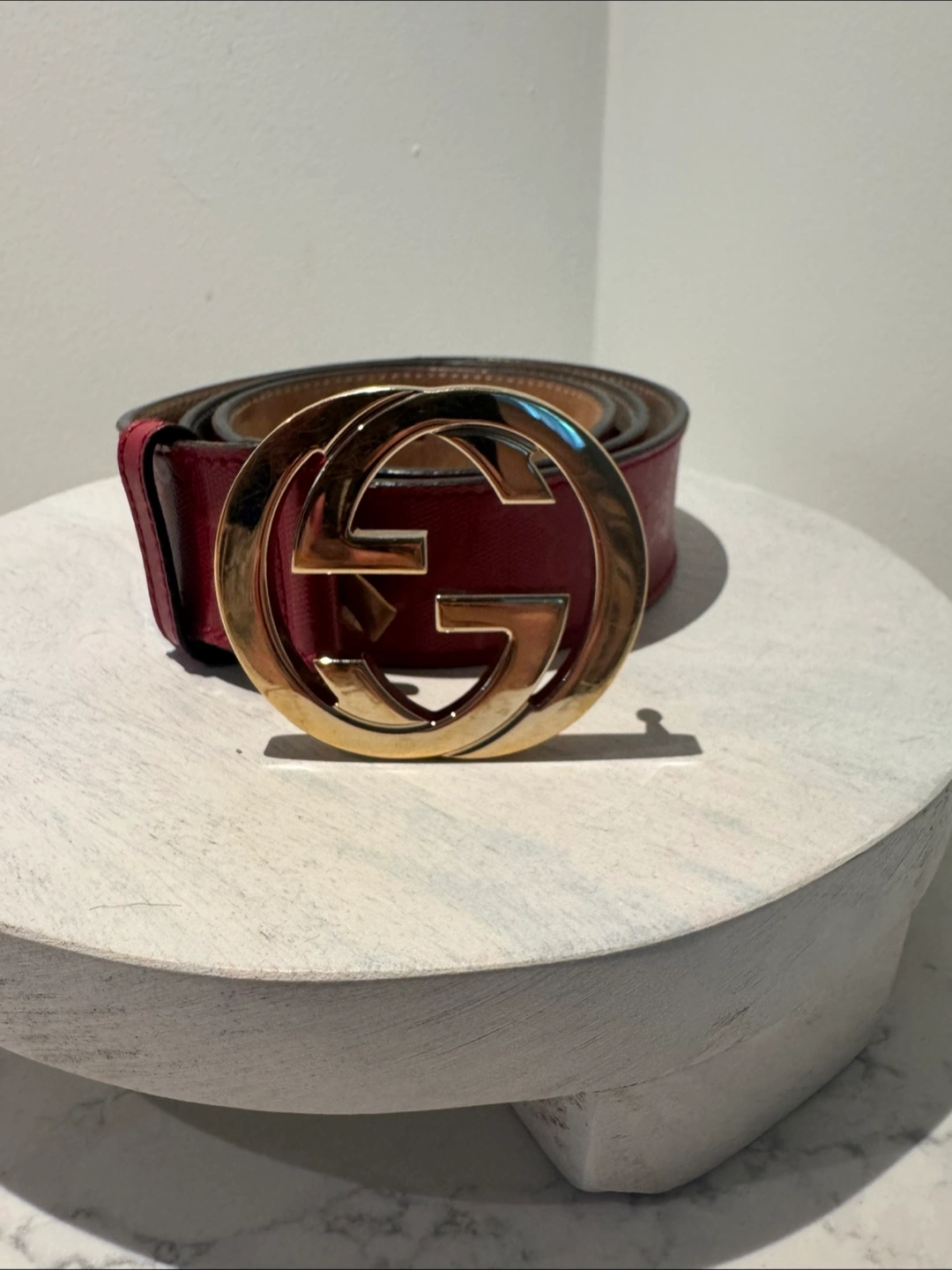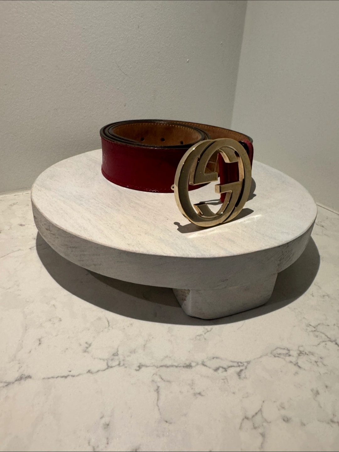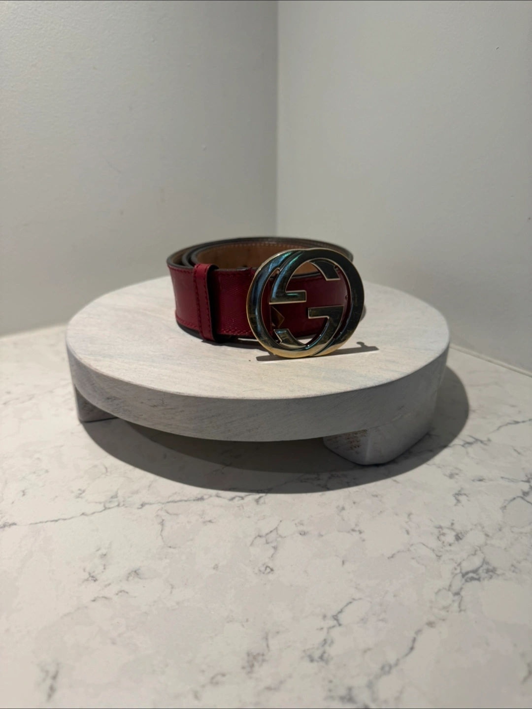 Authentic Red Gucci belt with double G emblem Measures 39 inches long Comes with dust bag Unisex
