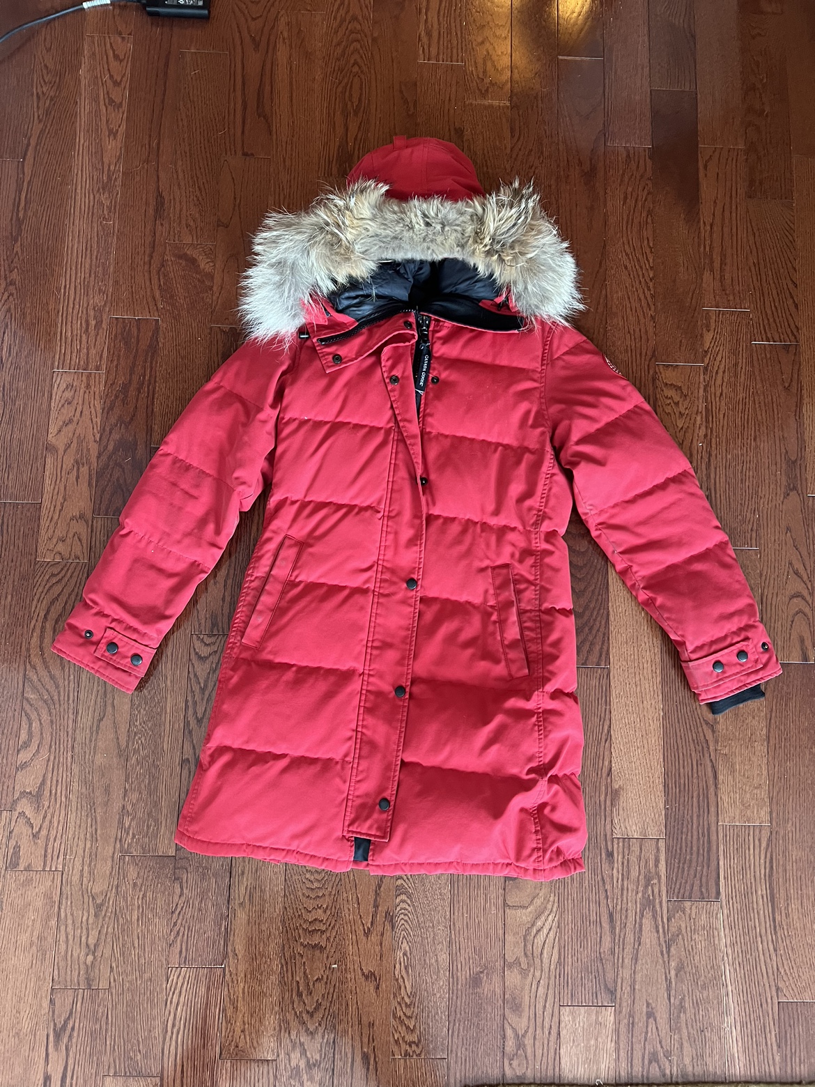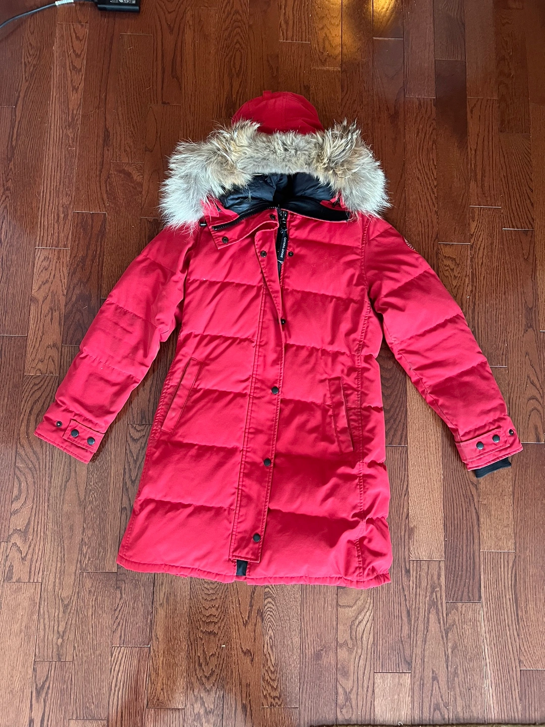 34Down-filled Goose Shelburne Parka with detachable coyote fur hood, mid-thigh length, and rated to -20°C. Women's size XS.