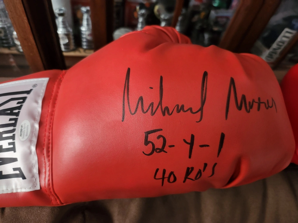 Red Everlast boxing glove. Features Michael Moorer's autograph, record, and knockout stats. Collectible item for boxing fans.