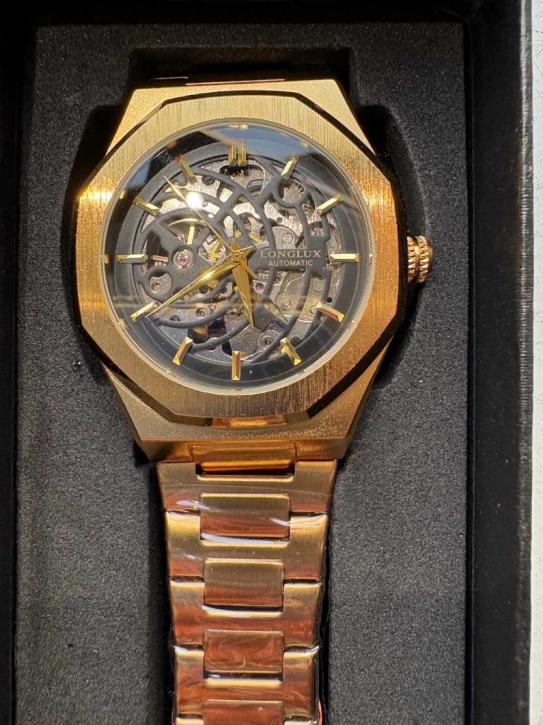 31Selling a LongLux automatic watch with a distinctive skeleton design. The watch features a gold-tone finish and comes with its original box. It's an eye-catching piece!