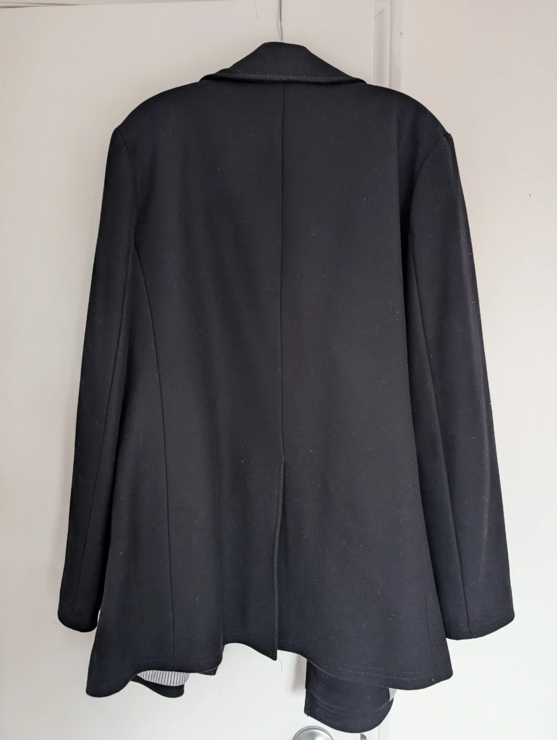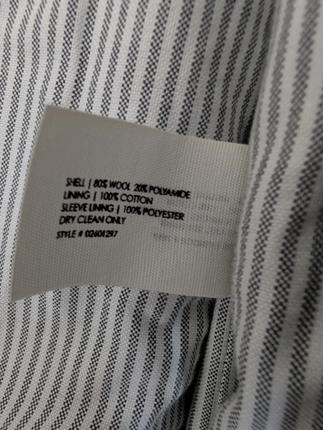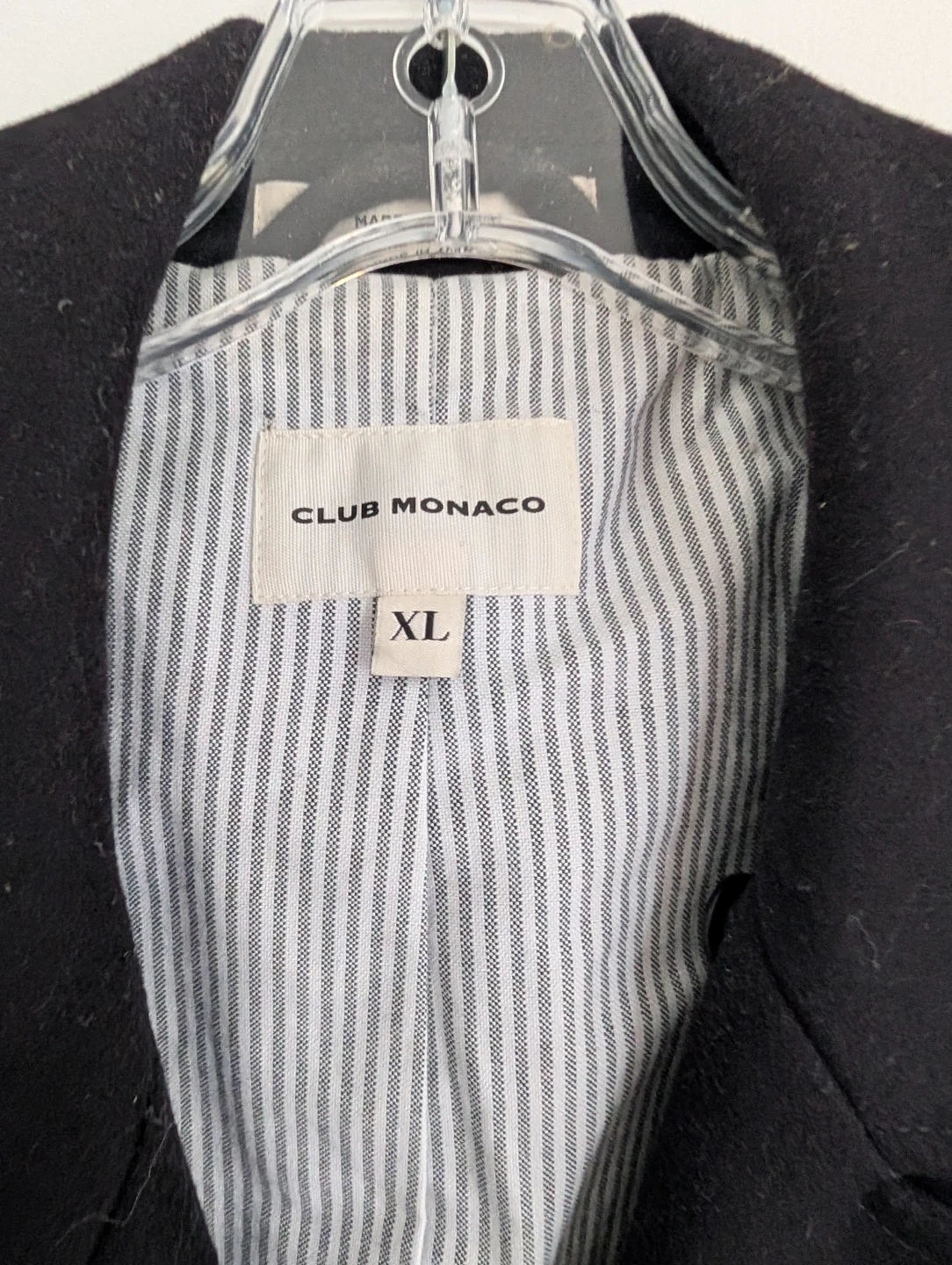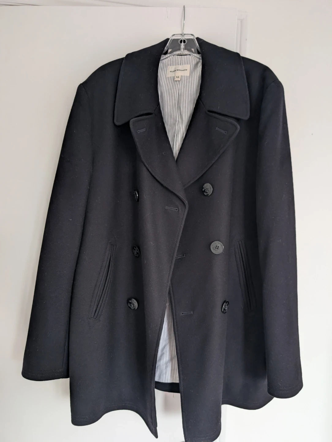This is a Club Monaco peacoat in black, size XL. It's made with a shell of 80% wool and 20% polyamide. The lining is 100% cotton, and the sleeve lining is 100% polyester. It's dry clean only. This coat is great for cooler weather!
