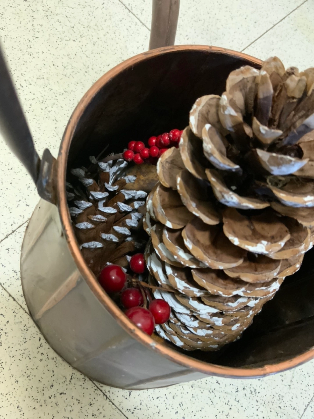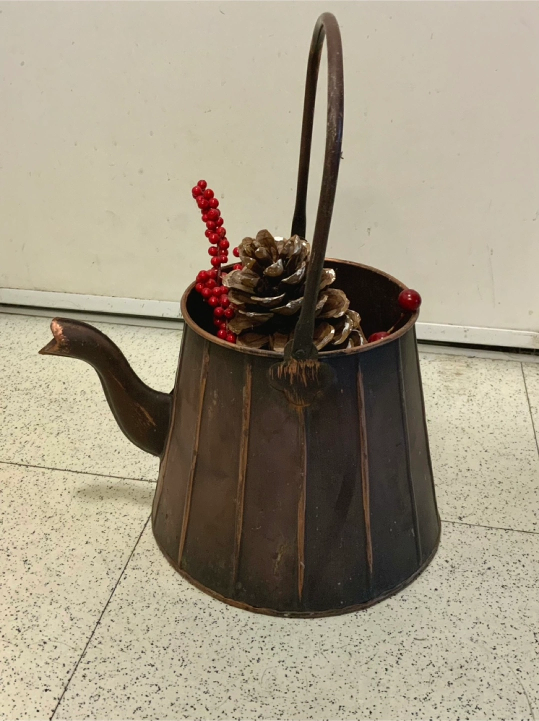 A Metal Teapot with Faux Pinecones and Red Berries on Twigs Perfect for Fall Decorating