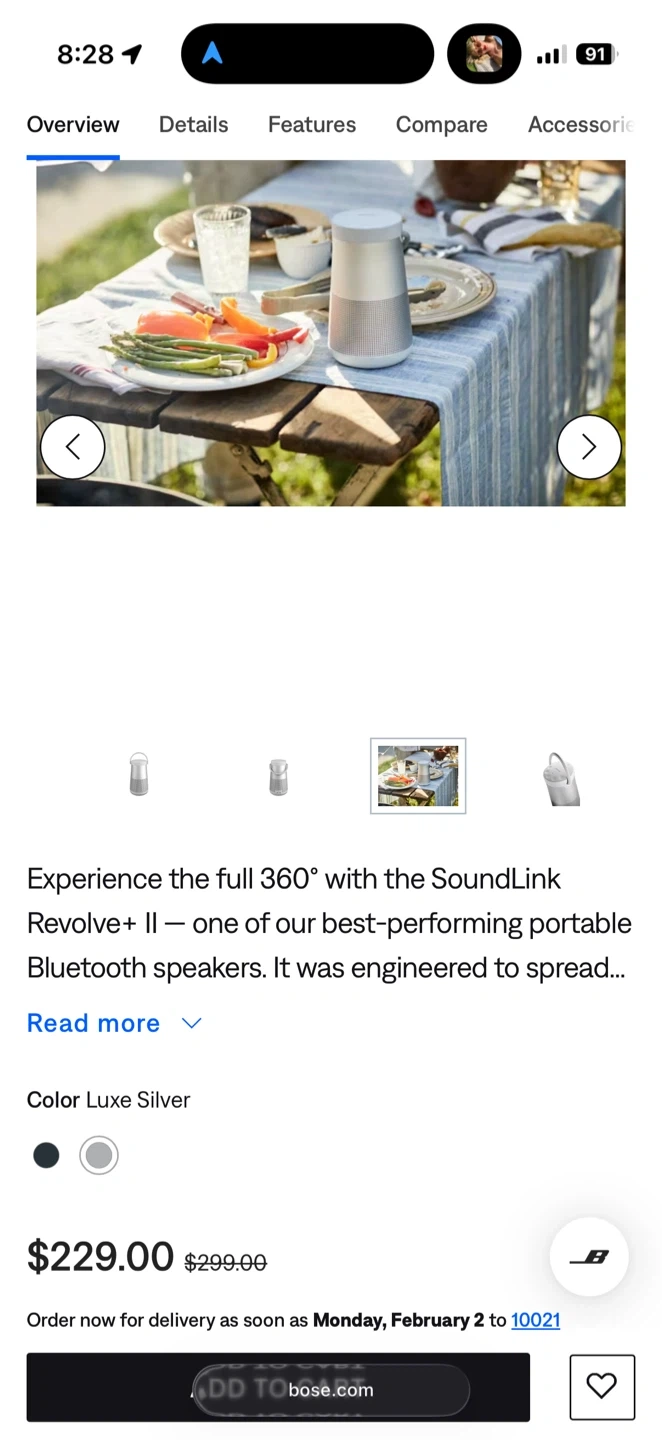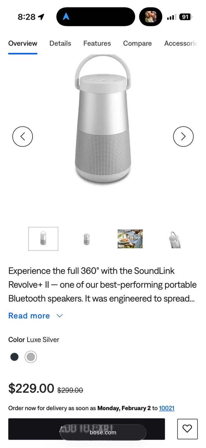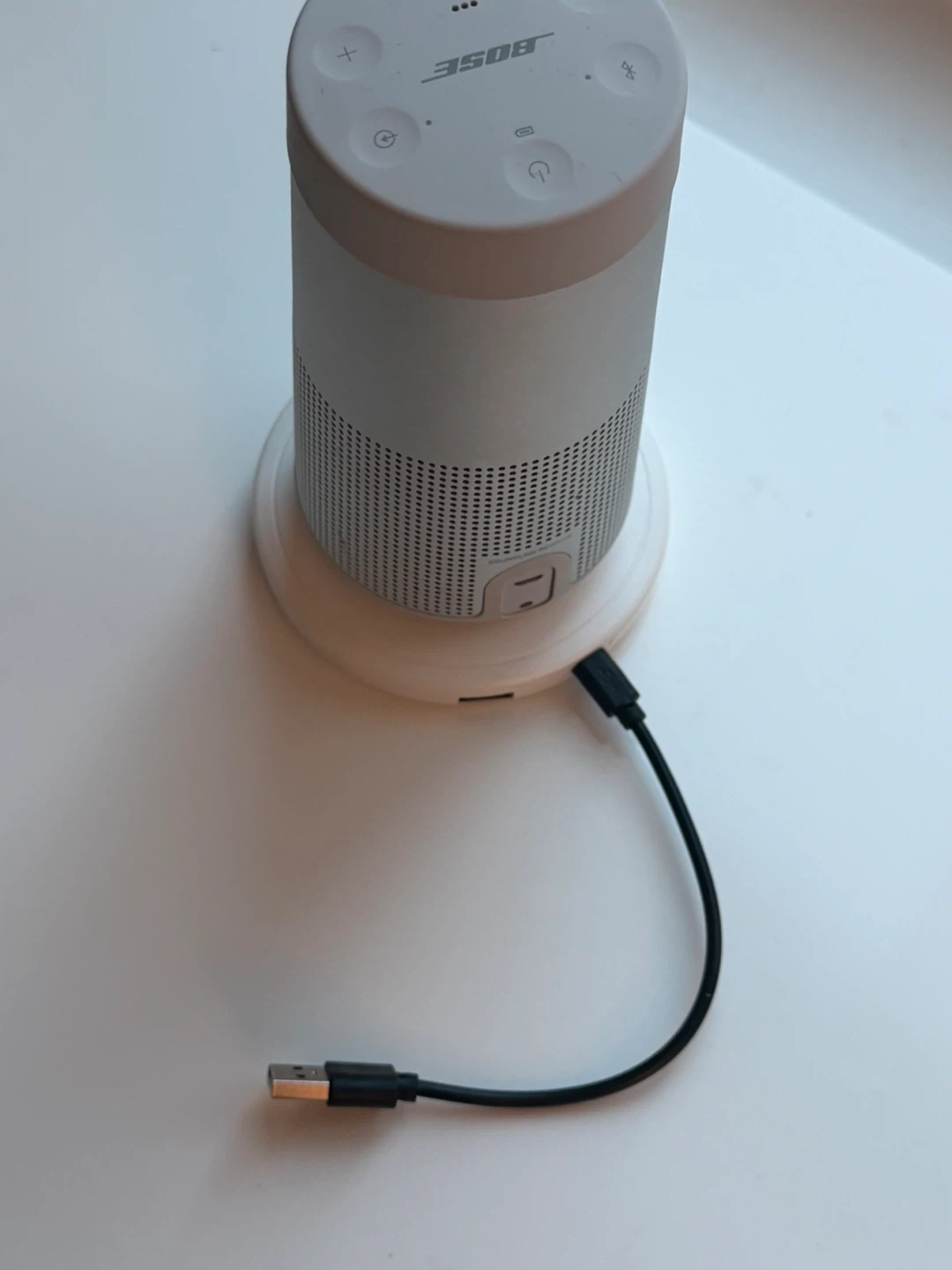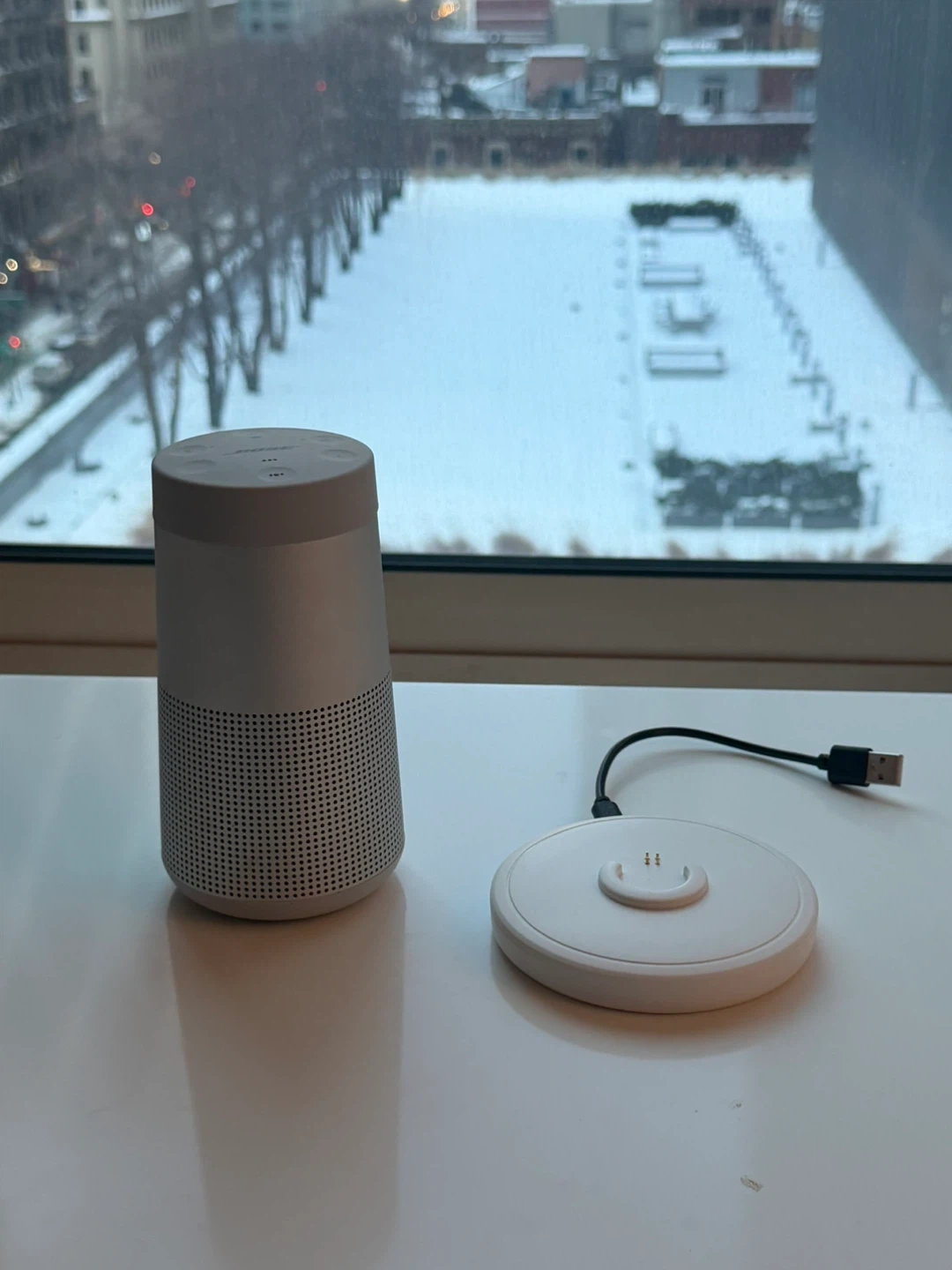 This is a Bose SoundLink Revolve portable Bluetooth speaker in silver. It comes with its original charging cradle and USB cable. It's great for enjoying music wirelessly.