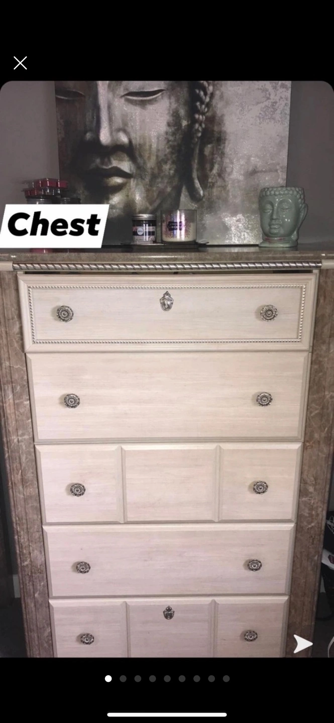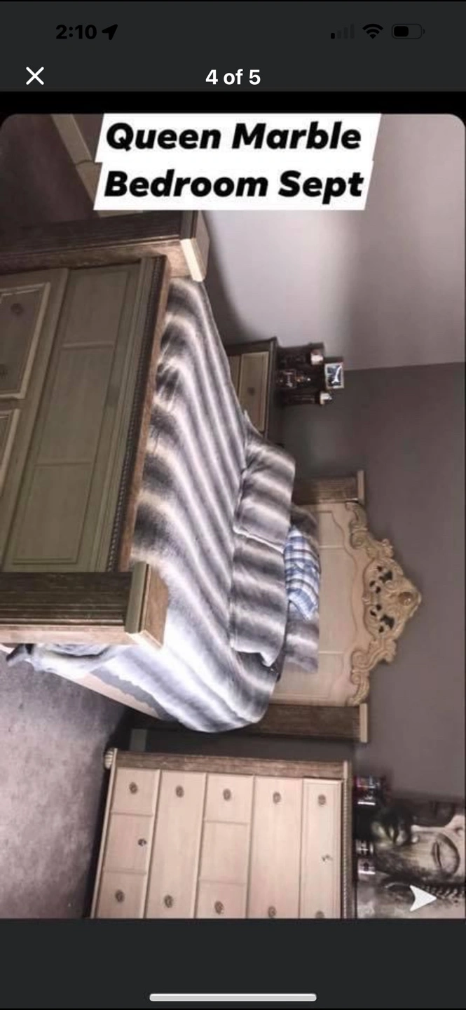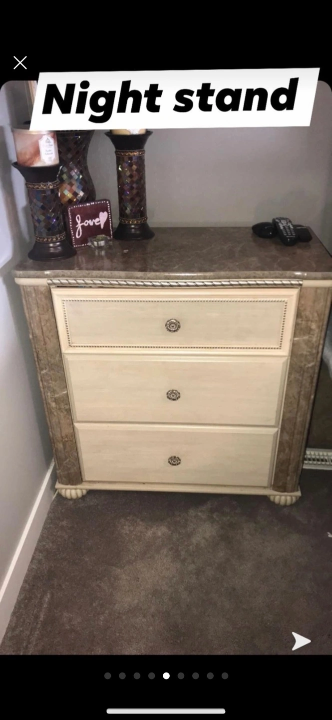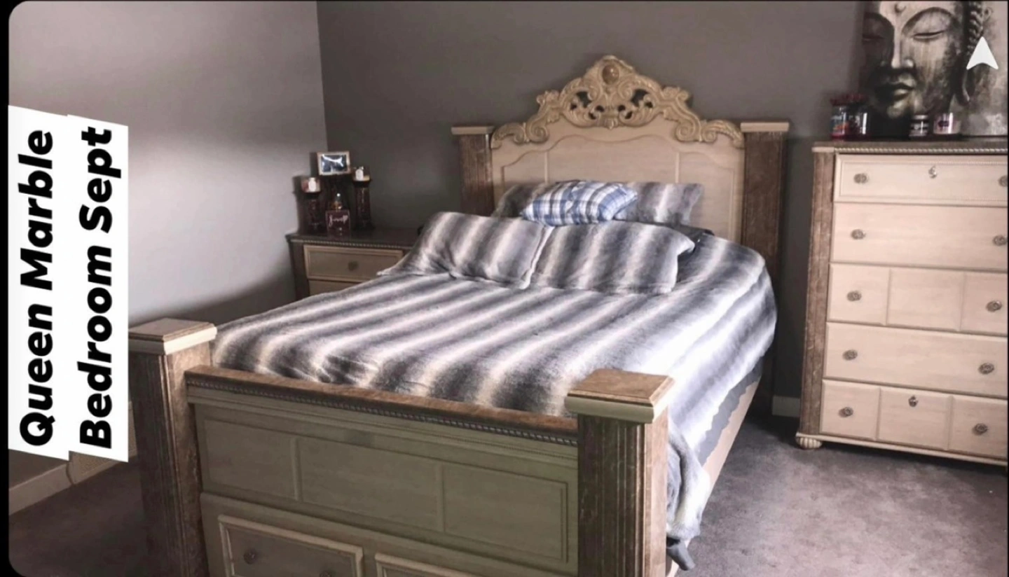 Beautiful marble bedroom set from Ashley Furniture. Amazing condition has one minimal small scratch on the nightstand. Everything else is in mint condition. Used for one year and paid almost $5500 for the entire set.. this beautiful bedroom set will last years to come. Delivery could be a possibility, depending on where and for an added fee.