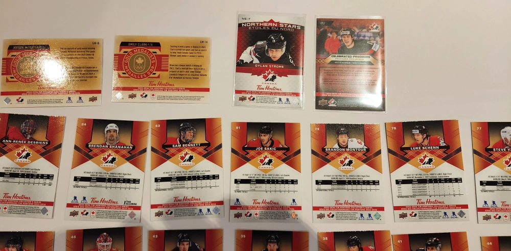 20 base cards + 4 inserts (x2 Gold Medalists; Emily Clark & Mason McTavish + x1 Celebrated Prodigies Mitch Marner + 1x Northern Stars Dylan Strome)