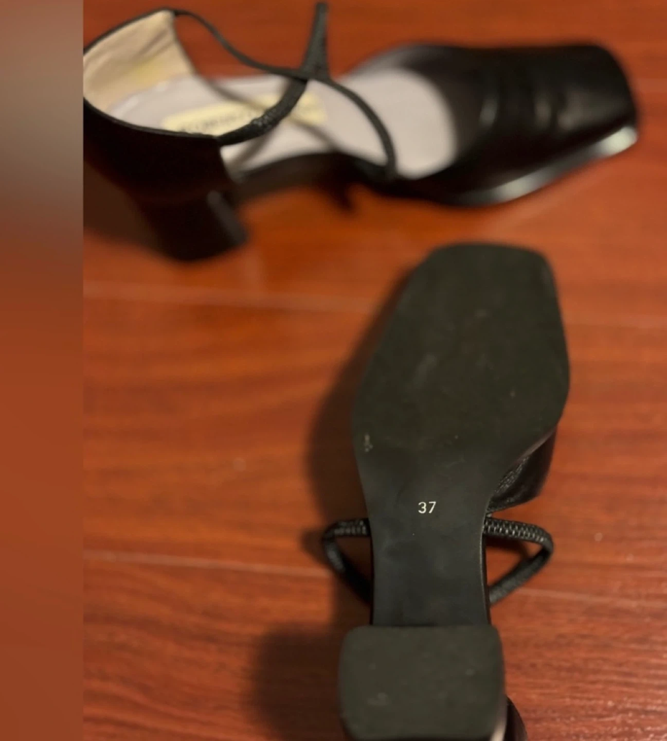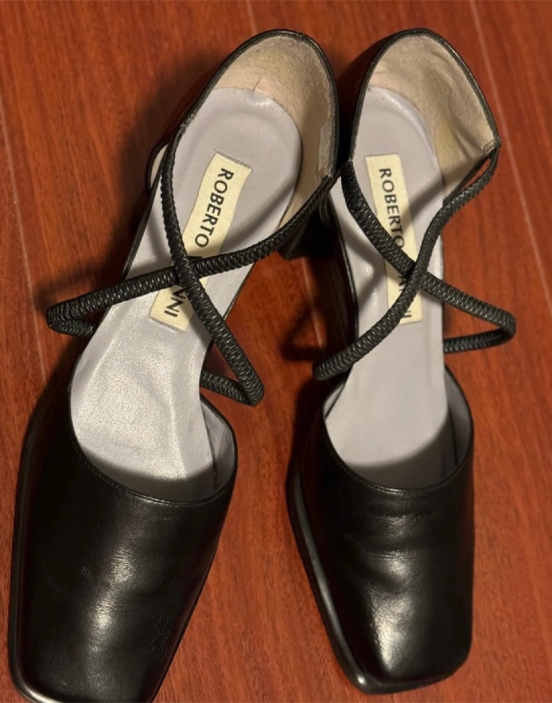 Selling a pair of Roberto Vianni black heels in size 37. They have a unique strappy design and a comfortable block heel.