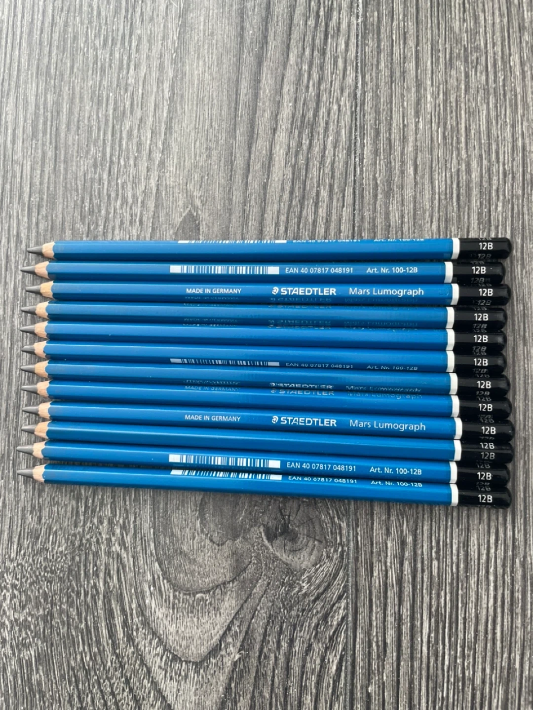 A set of 12 Staedtler Mars Lumograph 12B drawing pencils. These graphite pencils are made in Germany. They're great for sketching and shading.